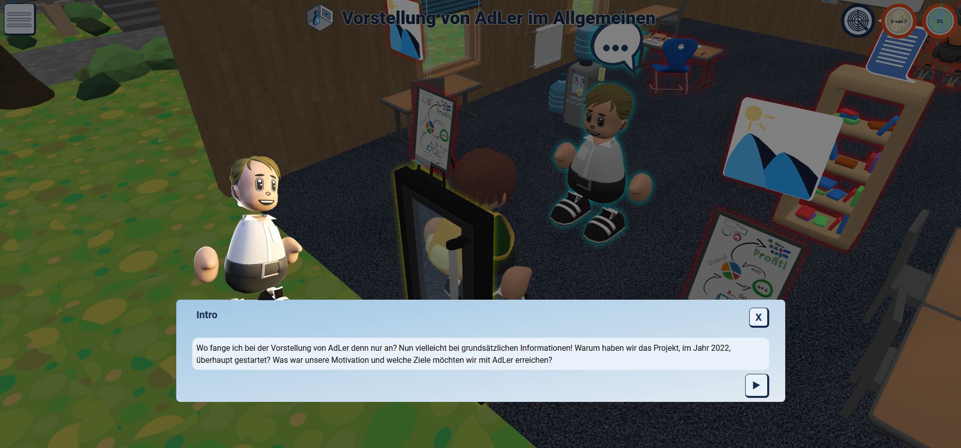 Durch die Verwendung der 3D-Lernumgebung soll v.a. die Motivation der Lernenden angesprochen werden. Dazu soll das Game-based Learning adressiert werden, indem verschiedene Spielelemente und -mechaniken in AdLer genutzt werden.