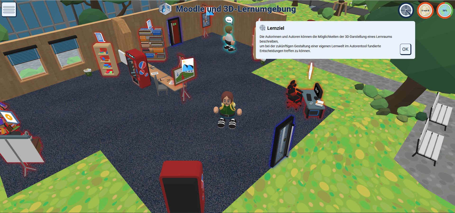 In folgender Abbildung ist ein praktisches Beispiel für die Darstellung der Lernziele in der 3D-Lernumgebung abgebildet.