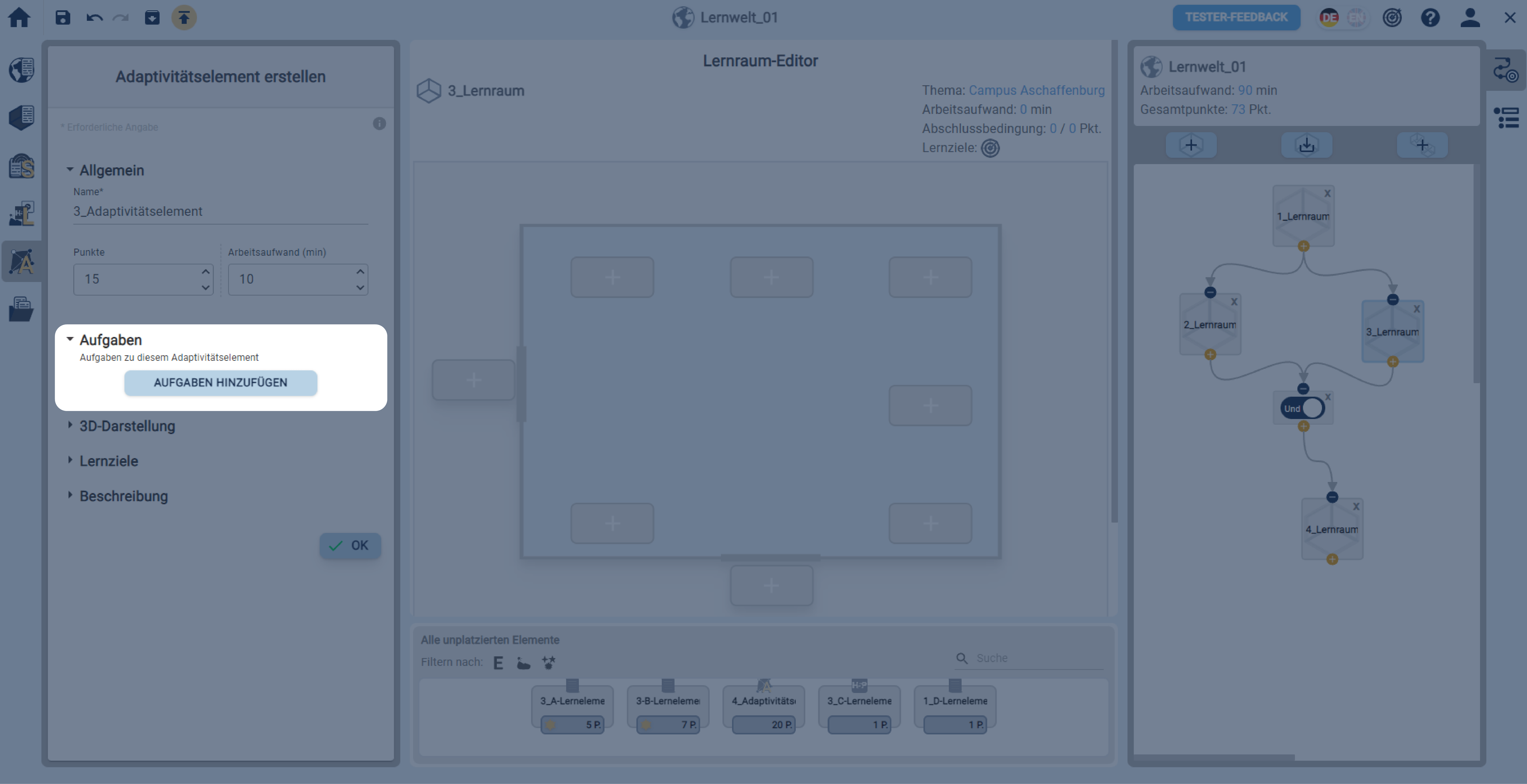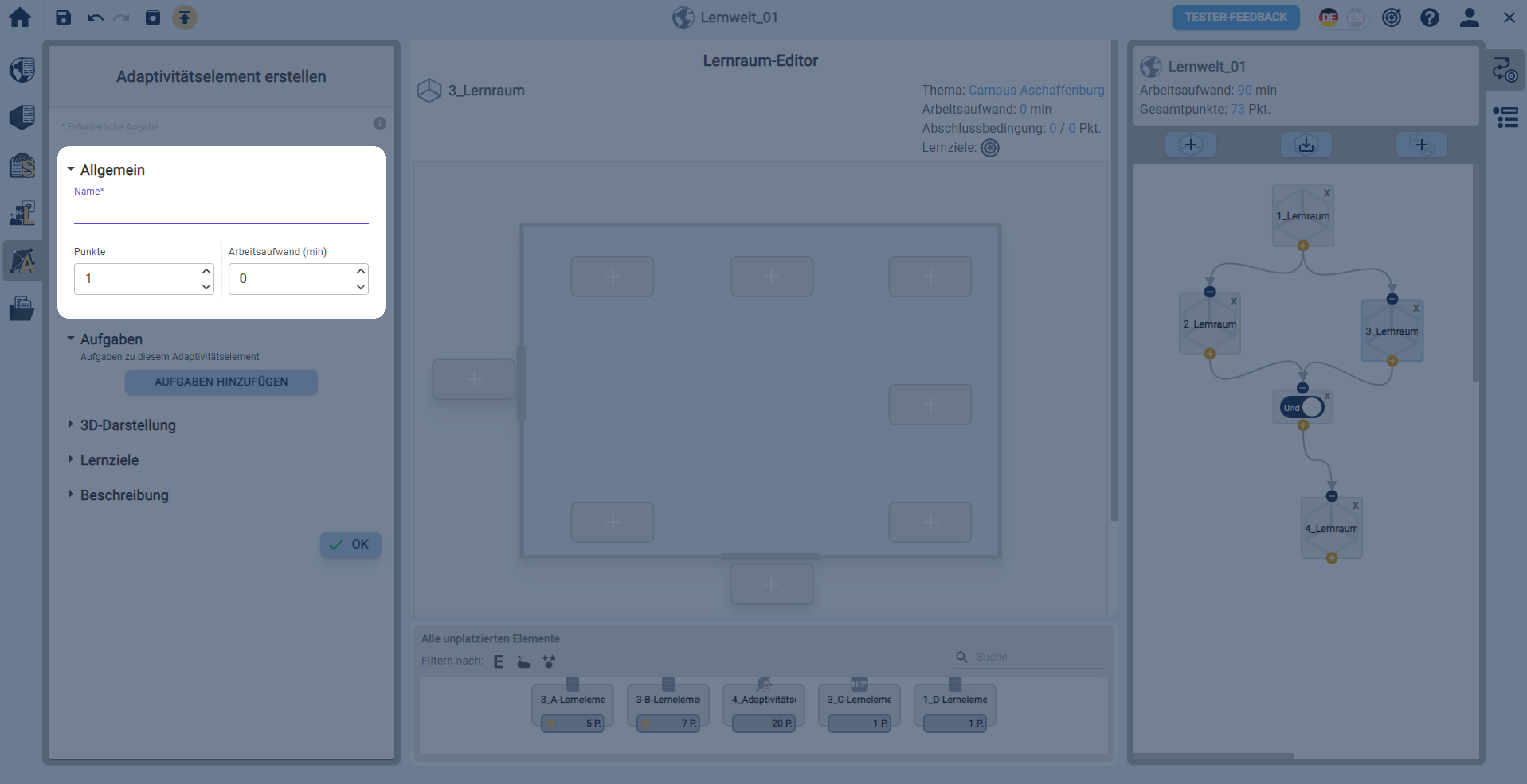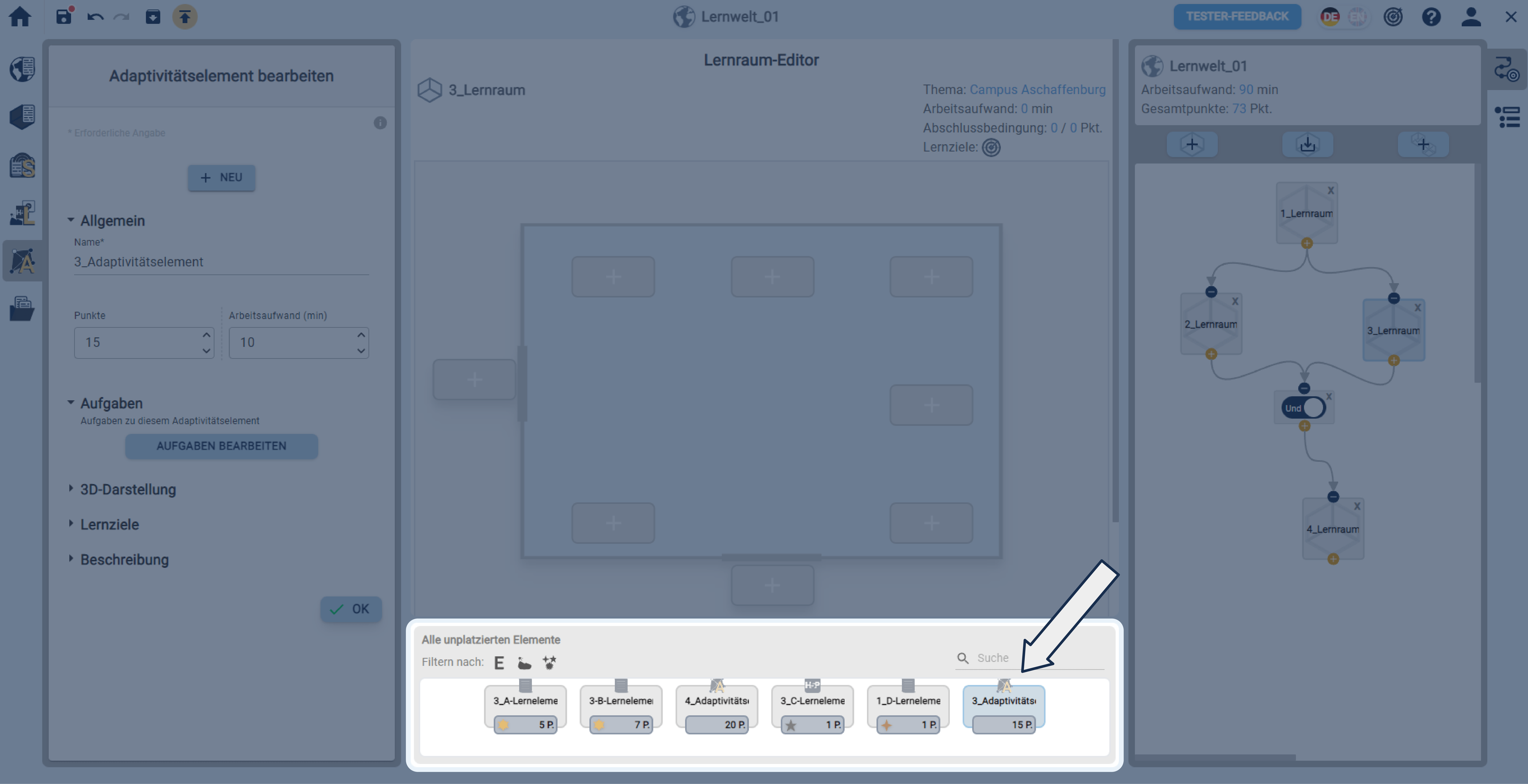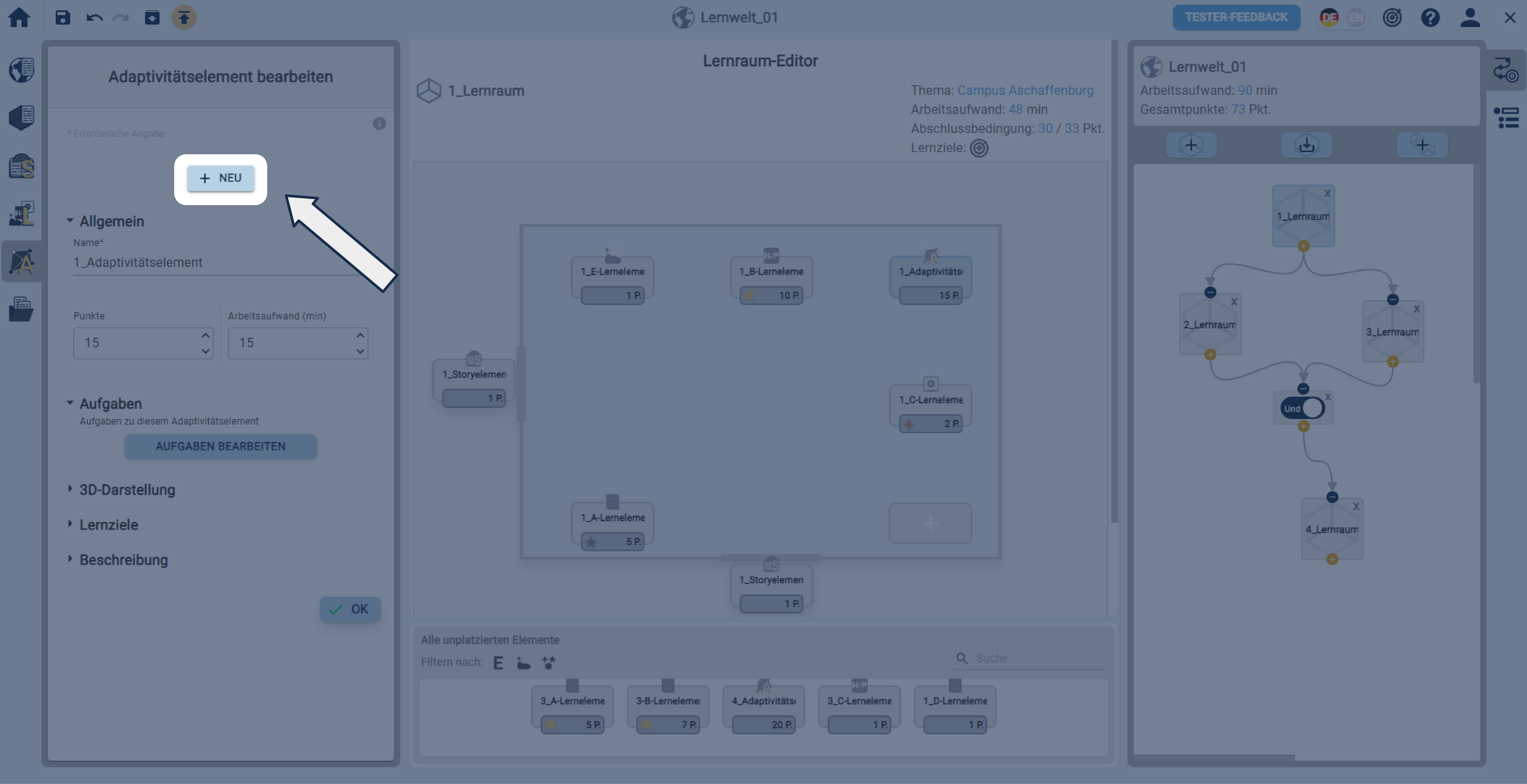 In einer geöffneten Lernwelt ein Adaptivitätselement über die linke Sidebar erstellen.