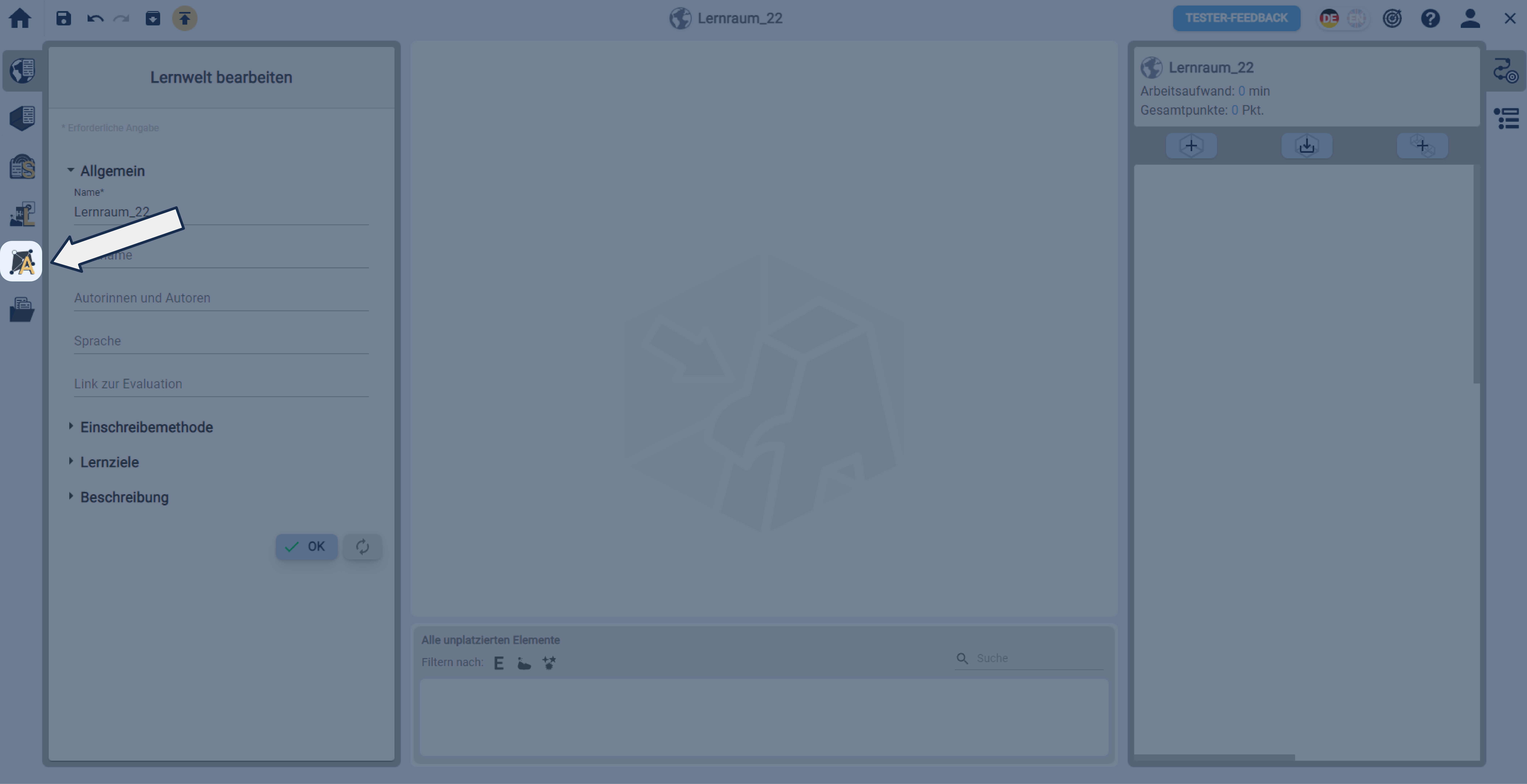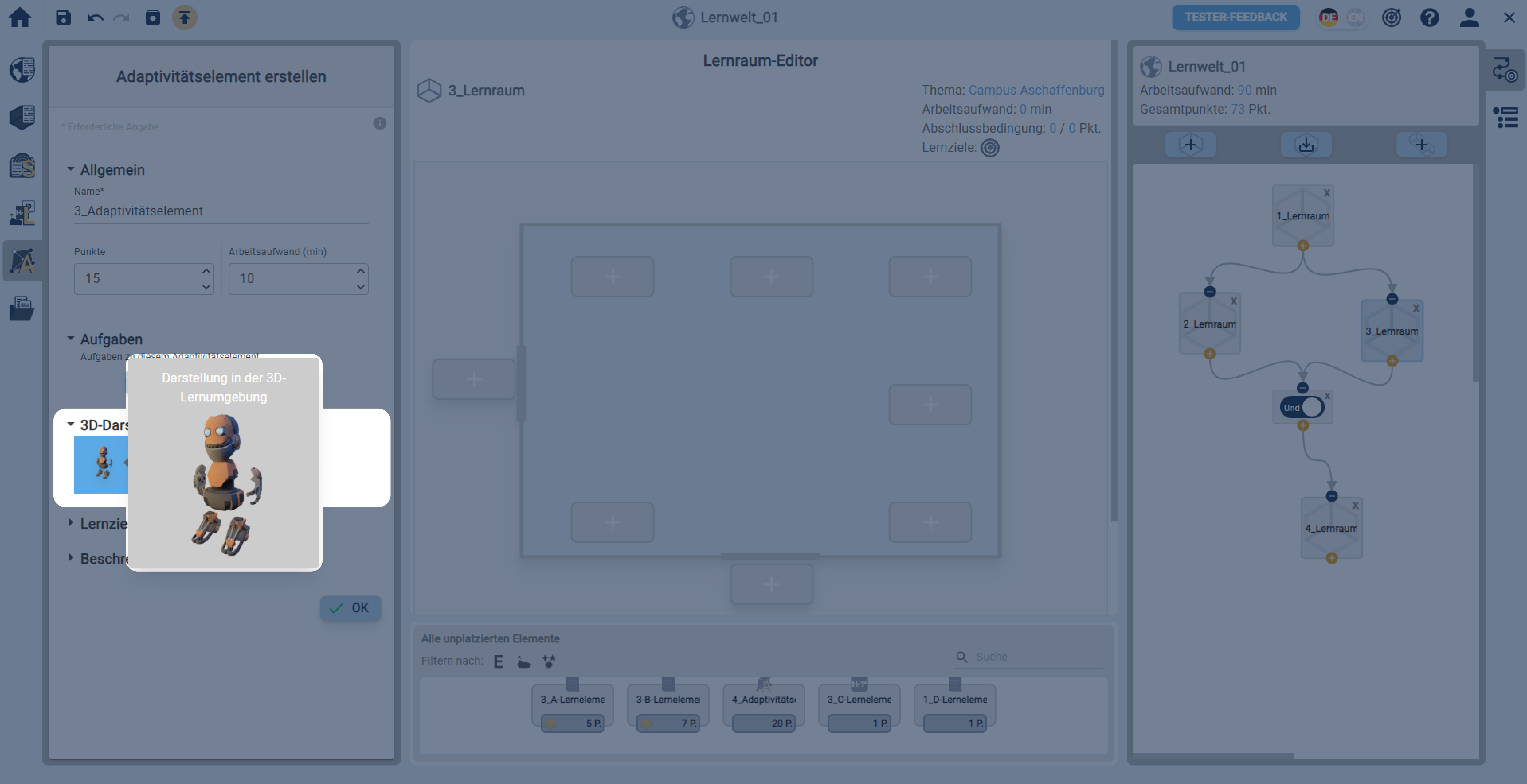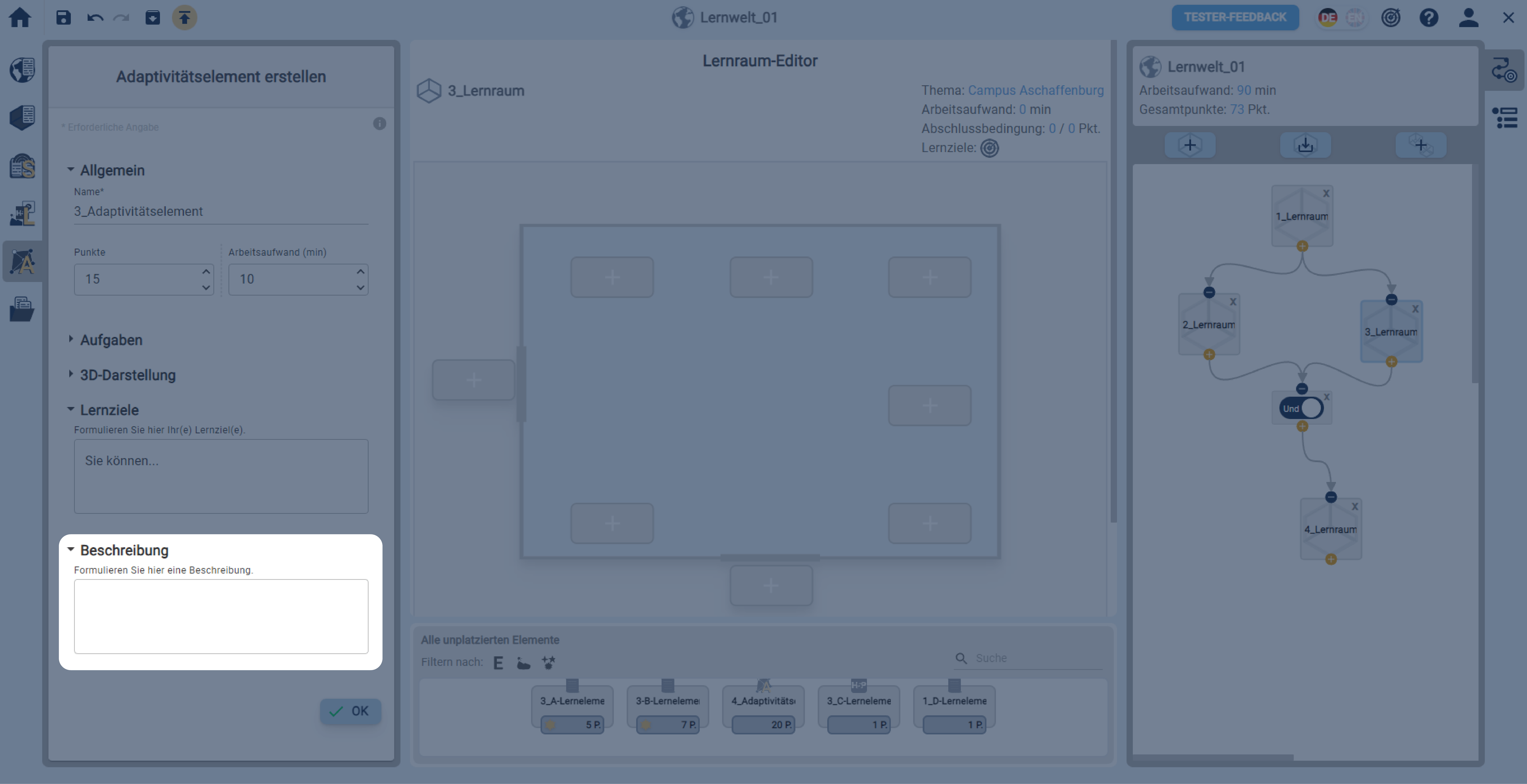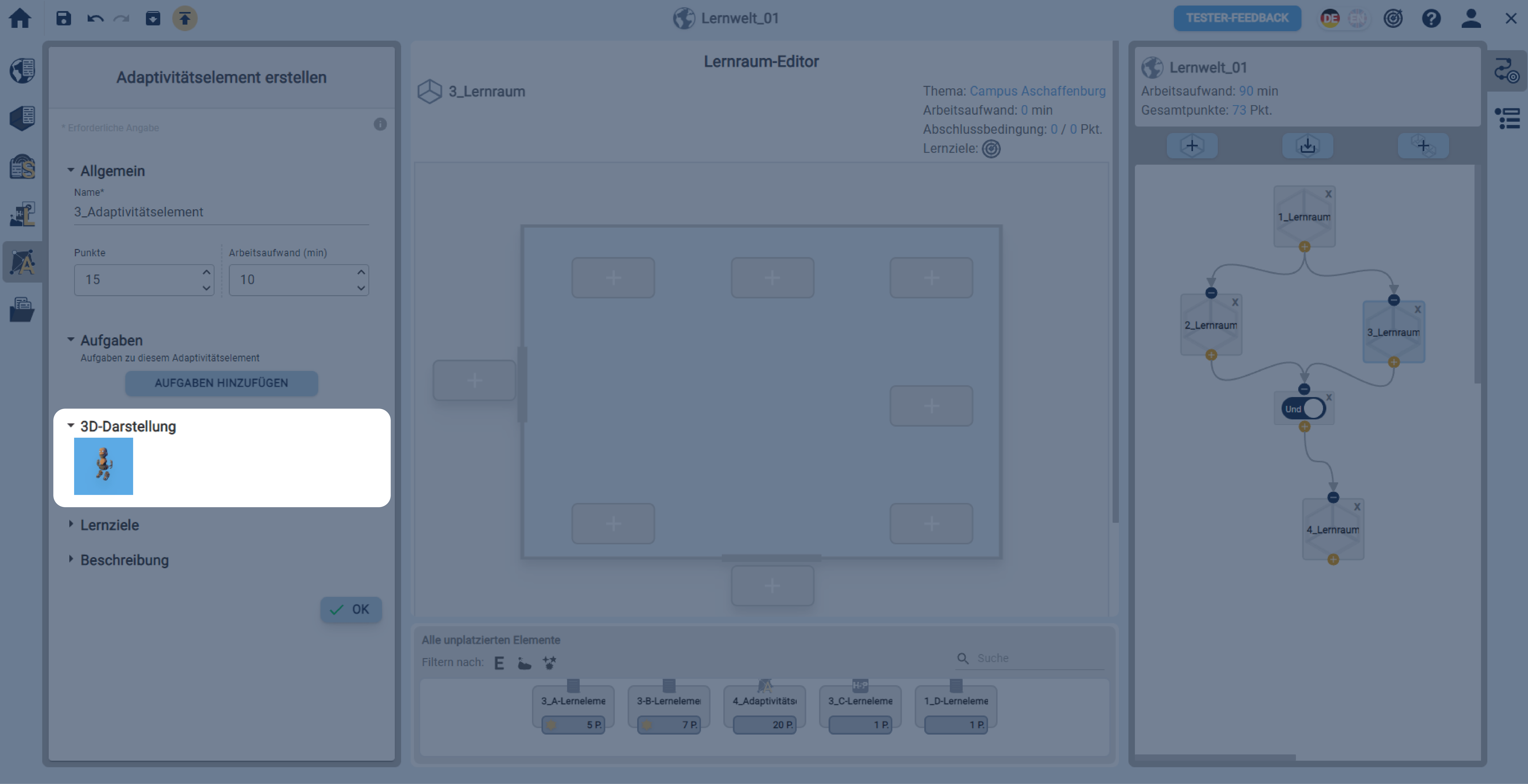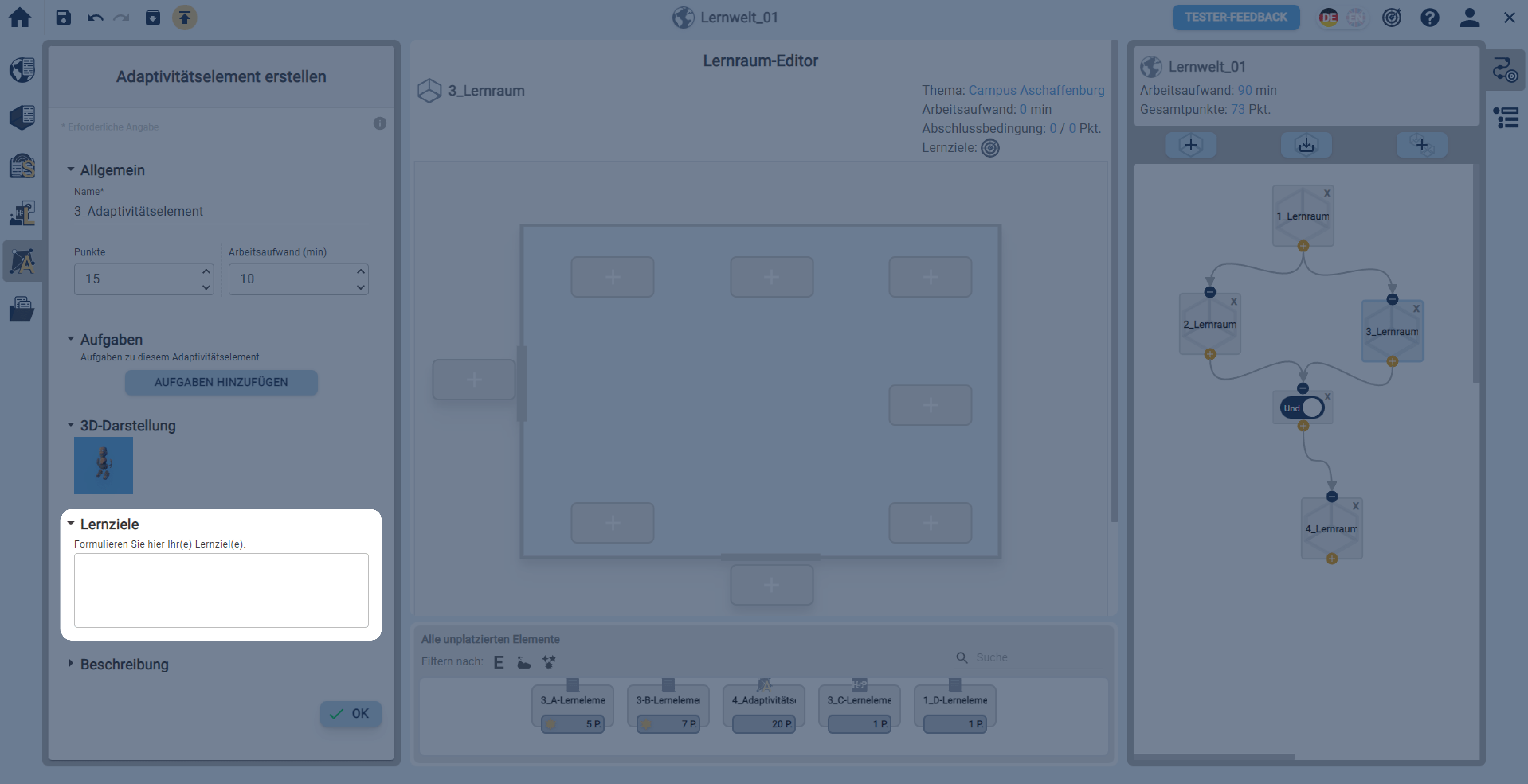 In einer geöffneten Lernwelt ein Adaptivitätselement über die linke Sidebar erstellen.