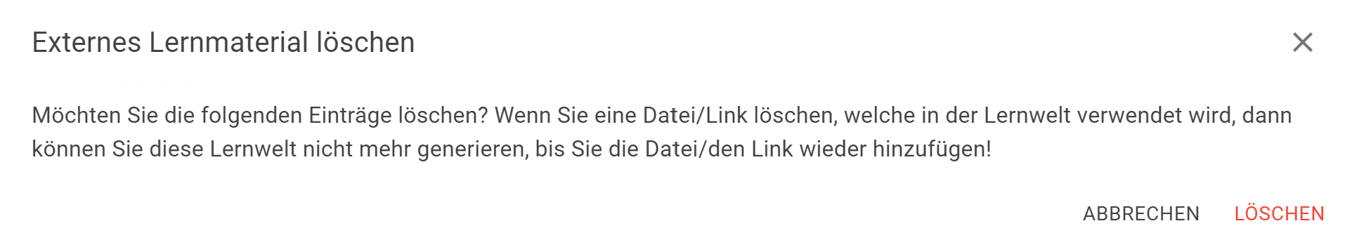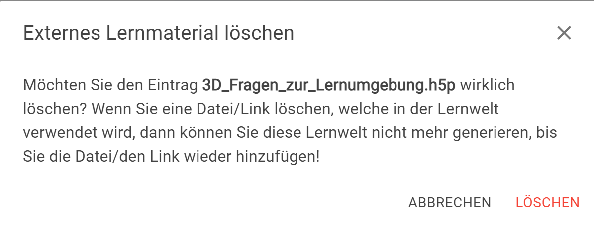 Klicken Sie auf den Button Löschen, um das externe Lernmaterial aus dem Autorentool zu entfernen. Drücken Sie den Button Abbrechen oder den Button X, um den Dialog ohne Löschung zu schließen.