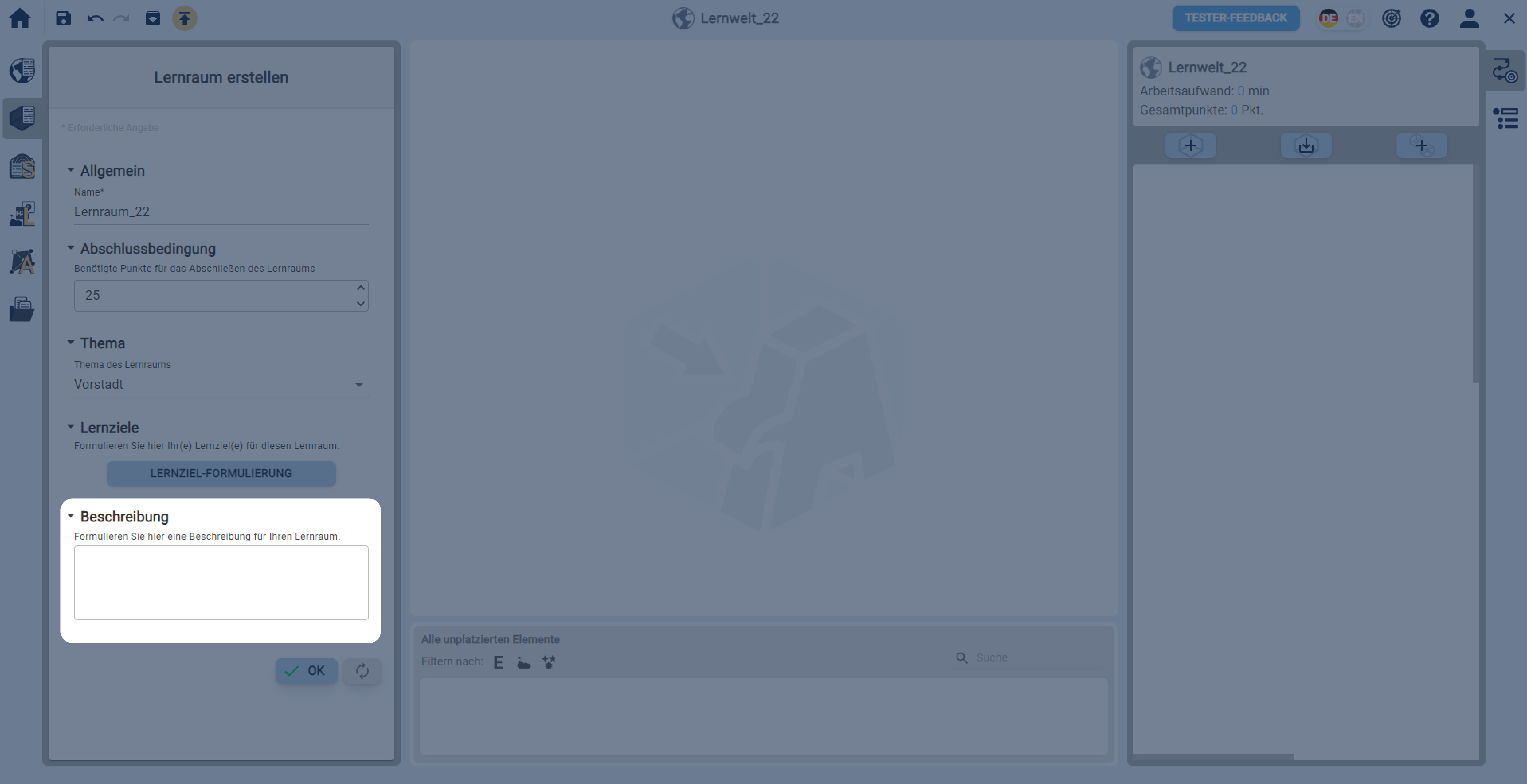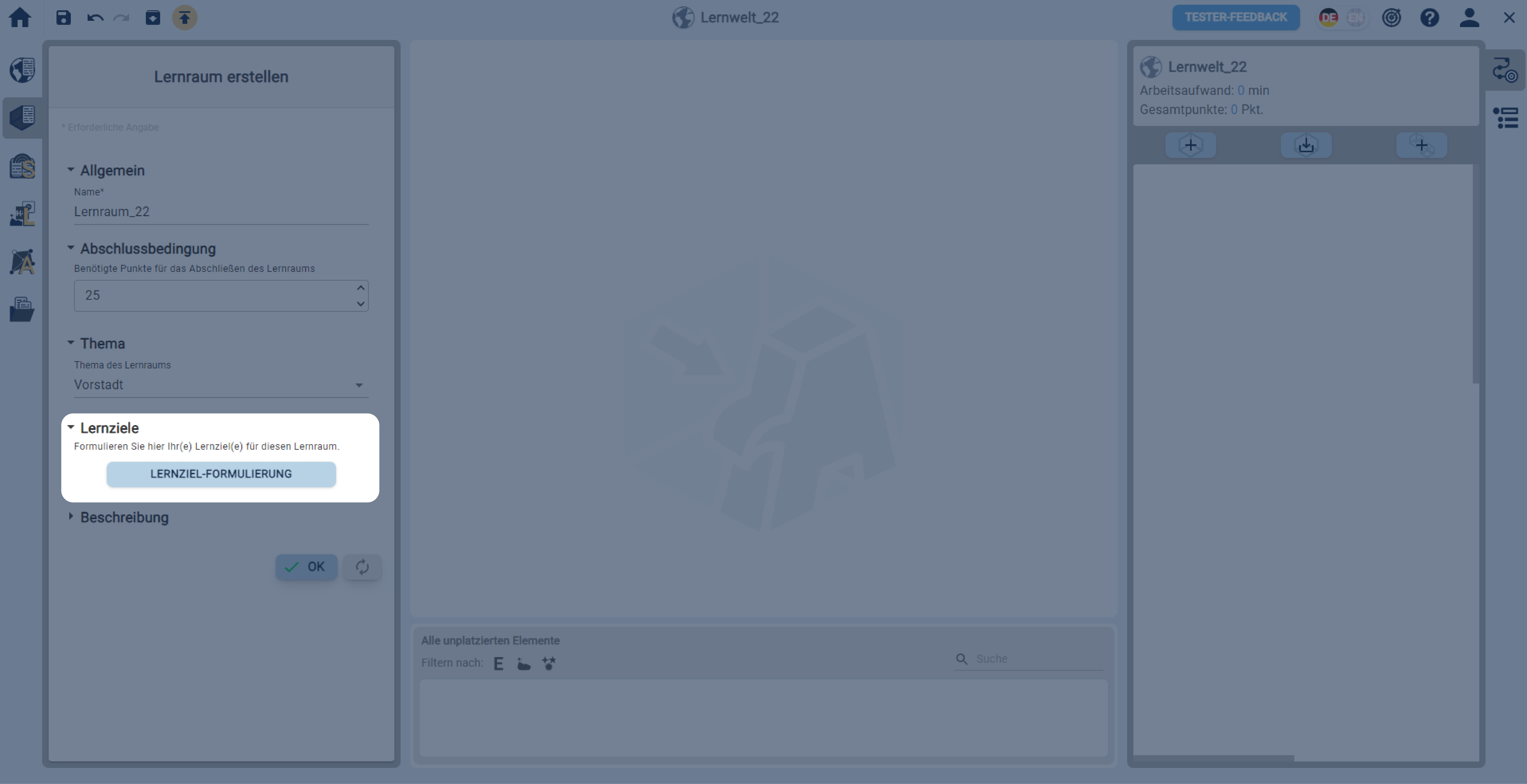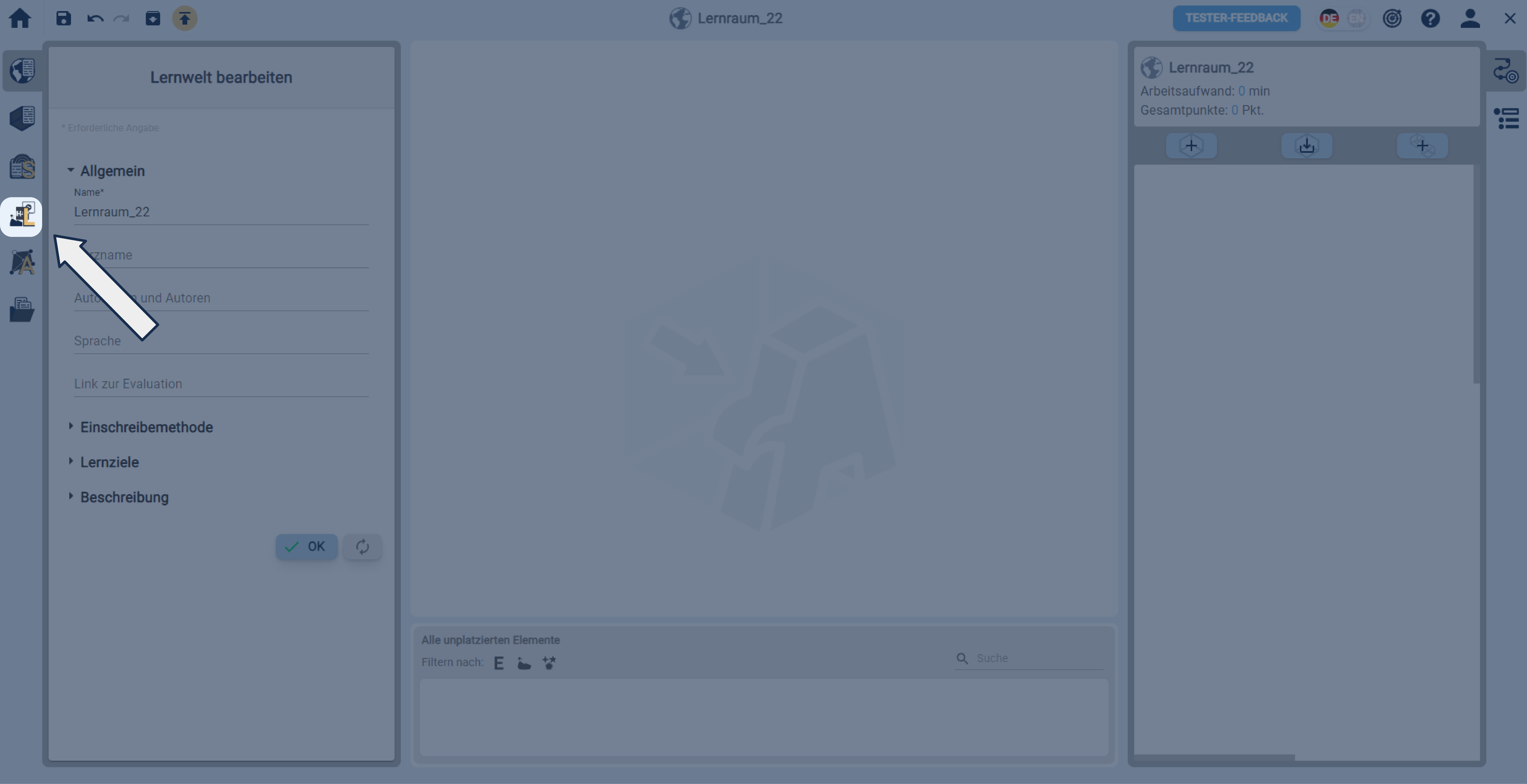 In einer geöffneten Lernwelt einen Lernraum über die linke Sidebar erstellen.
