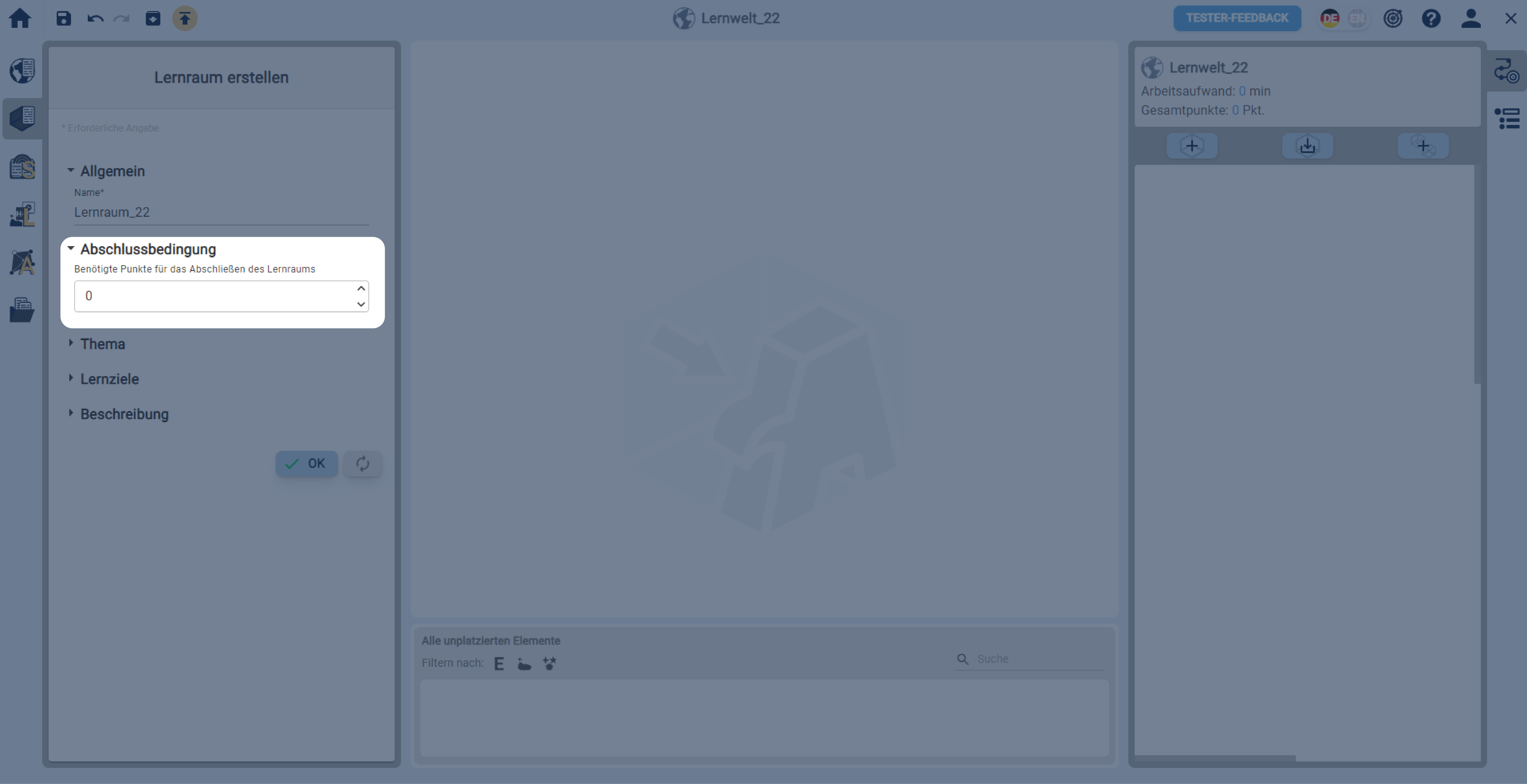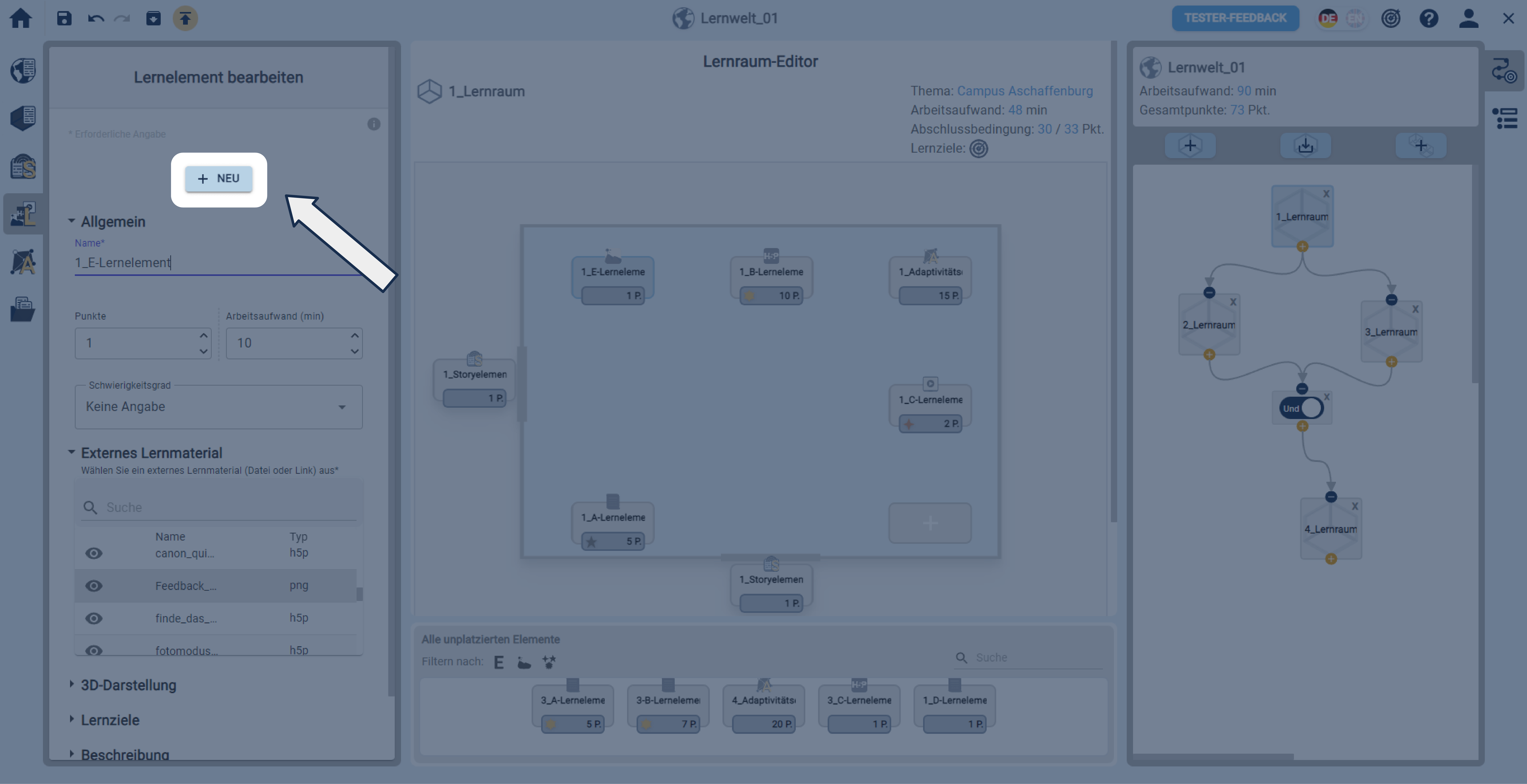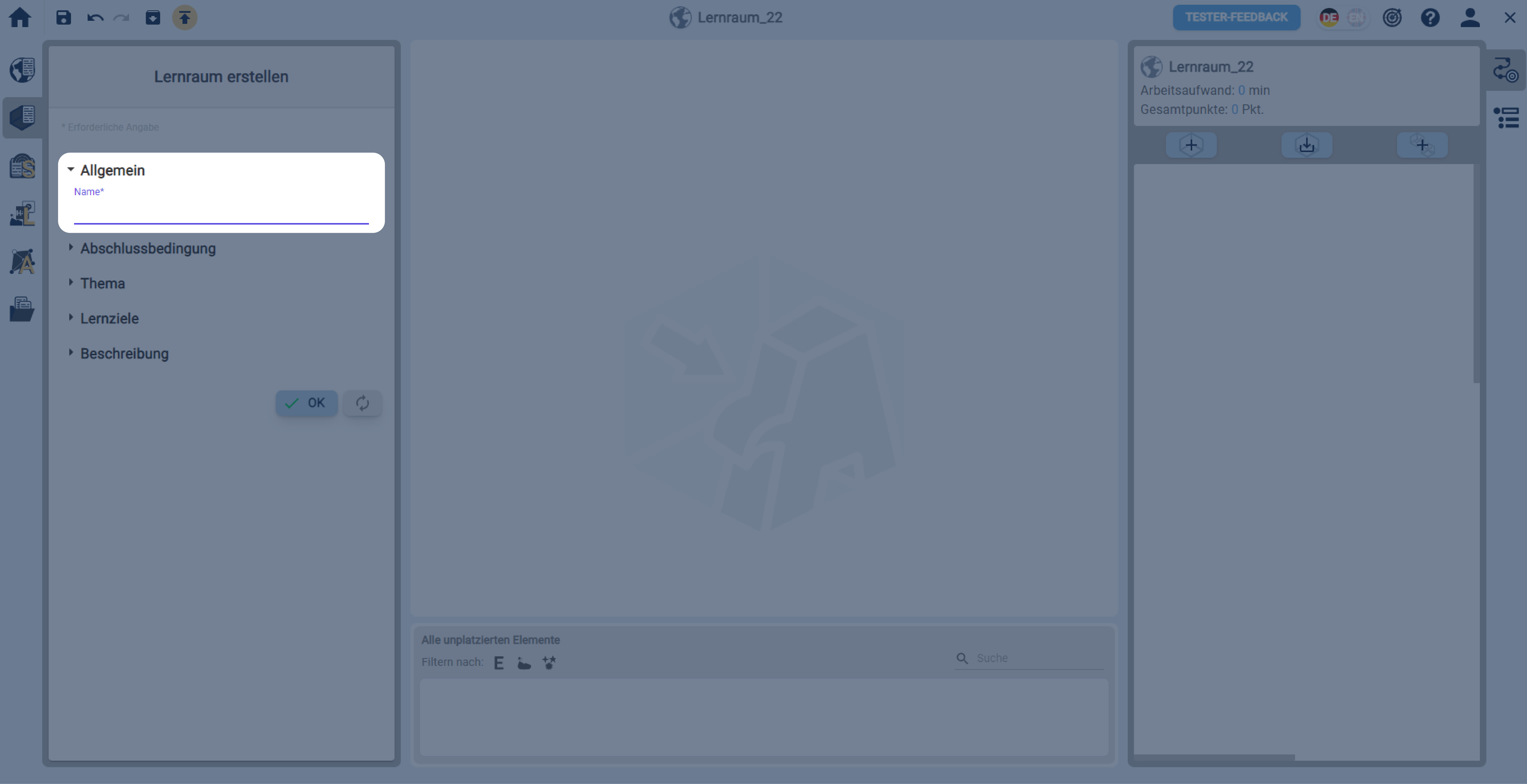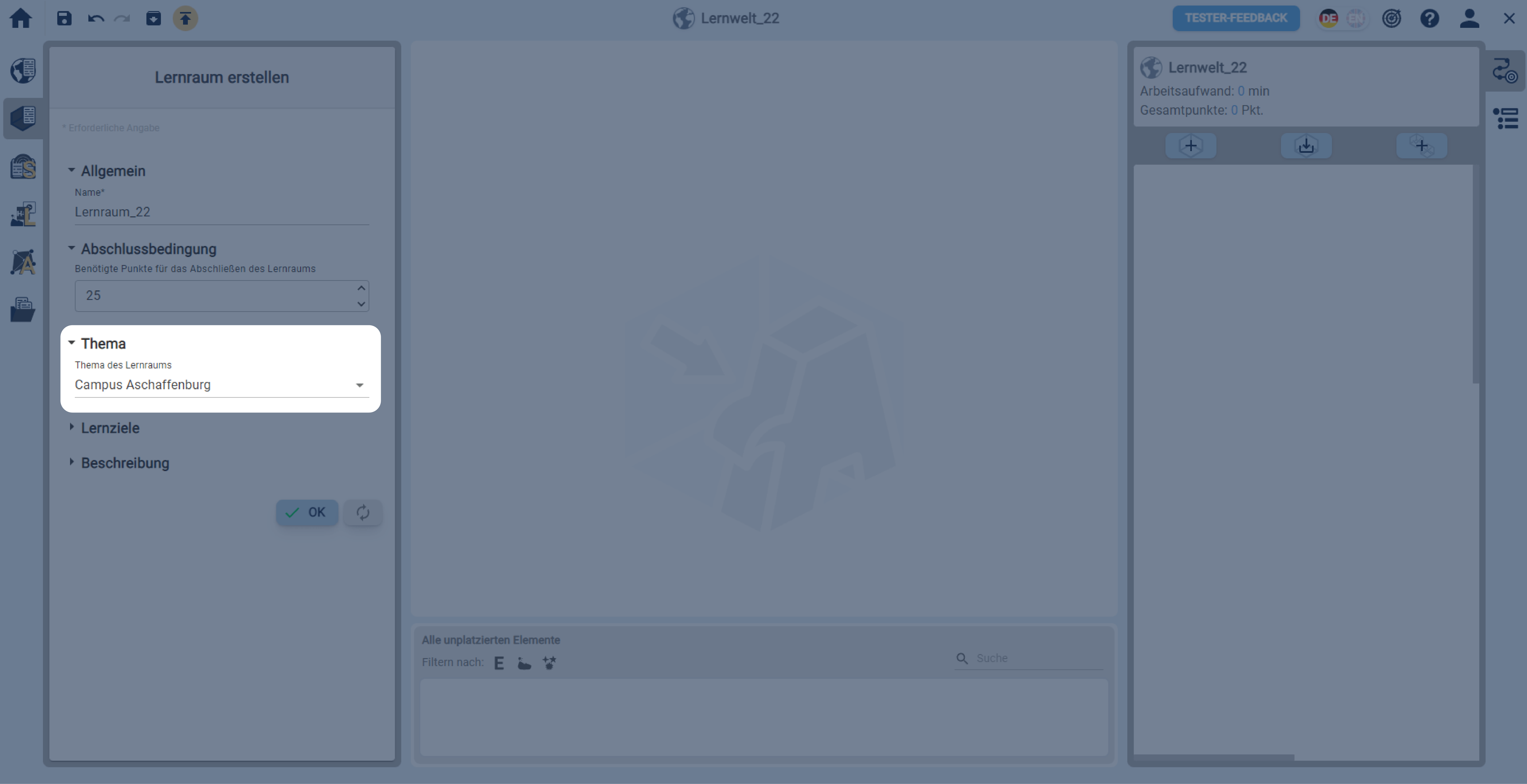 In einer geöffneten Lernwelt einen Lernraum über die linke Sidebar erstellen.