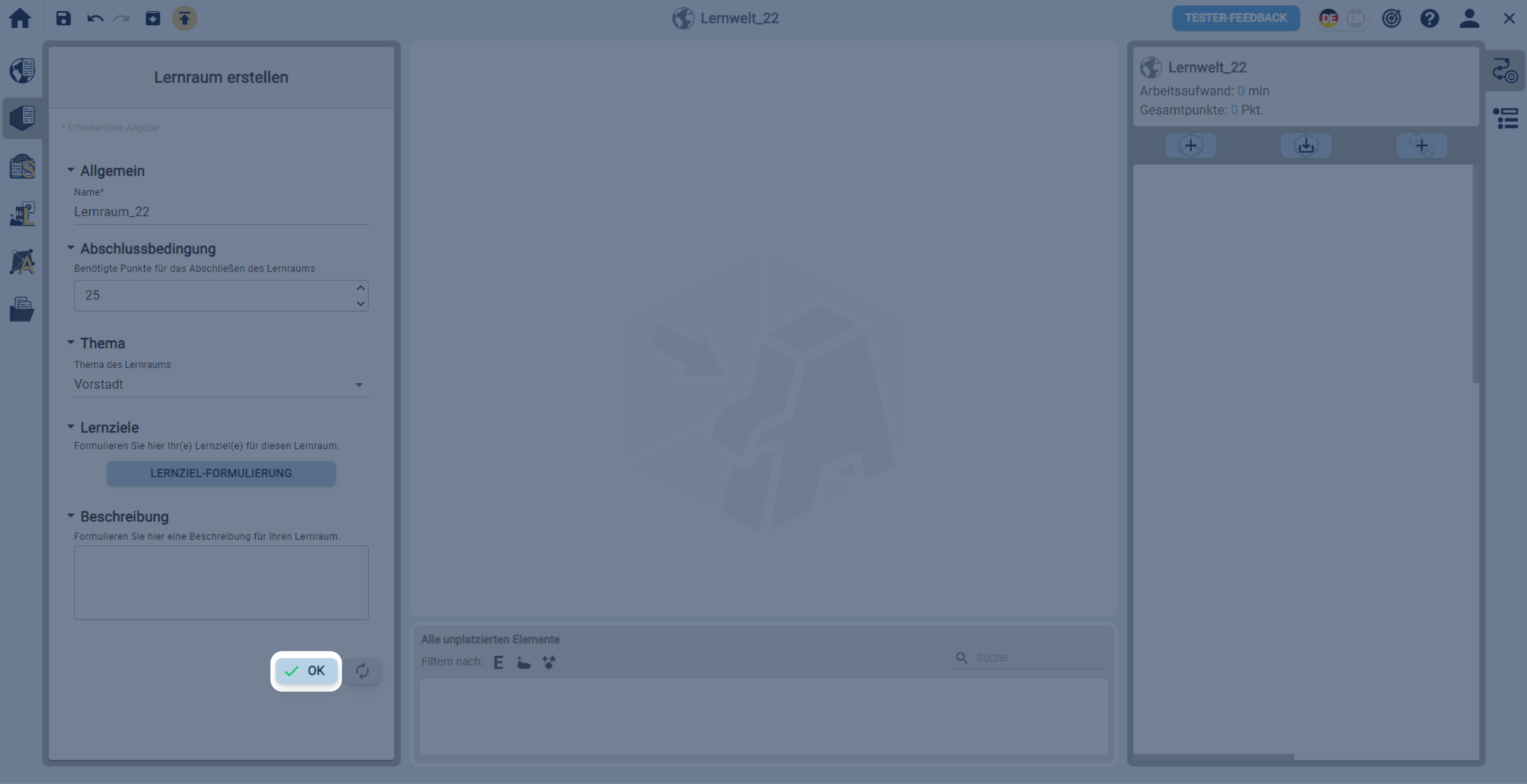 Bestätigen Sie Ihre Angaben zum Lernraum mit einem Klick auf den Button OK.