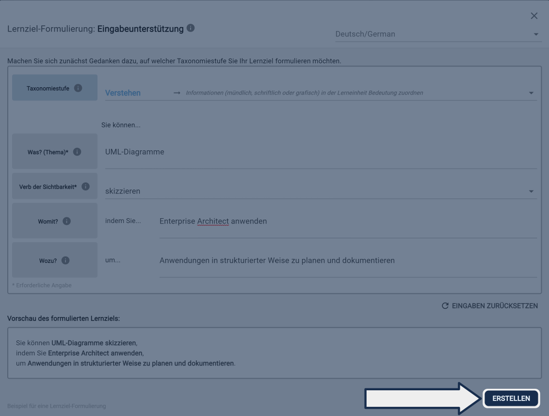Bestätigen Sie Ihr formuliertes Lernziel mit einem Klick auf den Button Erstellen.