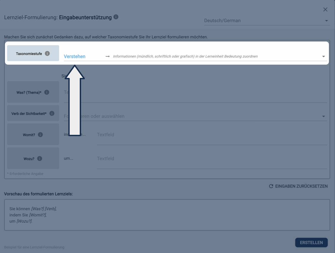 Wählen Sie in dem sich nun öffnenden Fenster in dem ersten Auswahlbereich die Taxonomiestufe, der Ihr Lernziel zugeordnet werden soll.