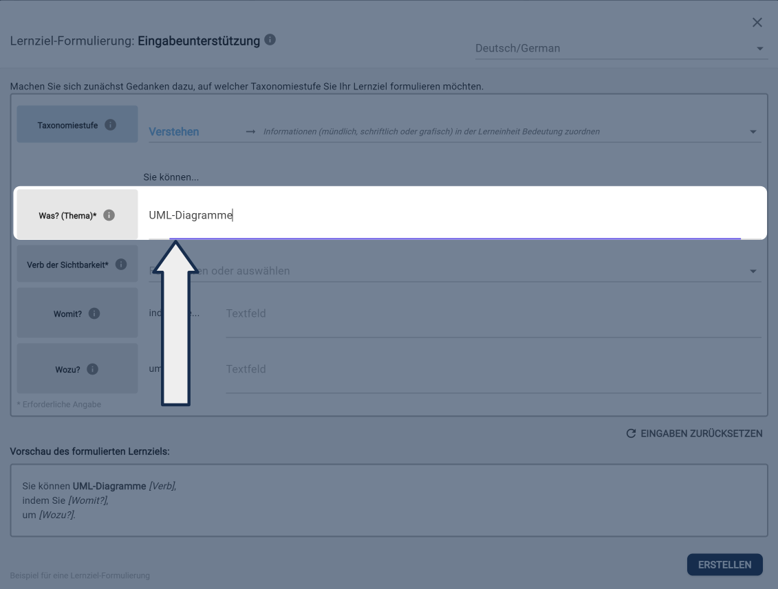 Tragen Sie im Textfeld zu Was? (Thema) das Thema Ihres Lernziels ein.