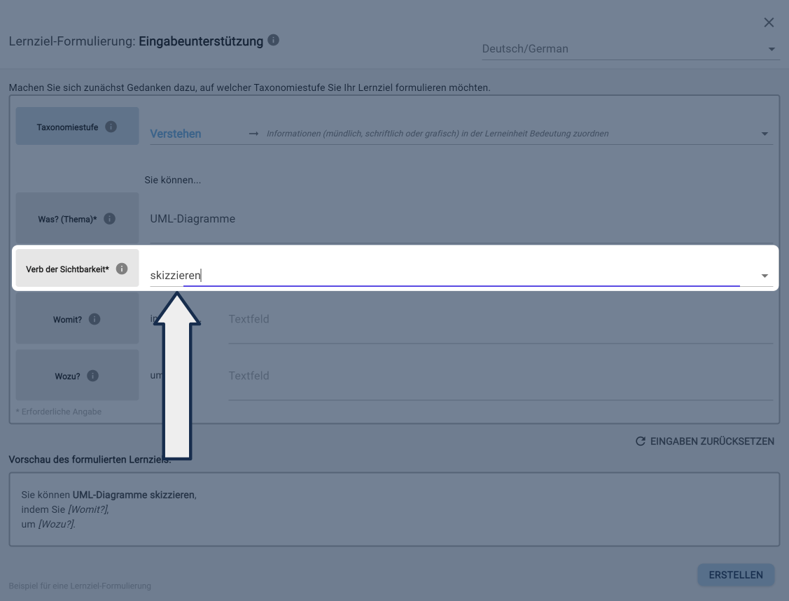 Wählen Sie im nächsten Auswahlbereich das passende Verb der Sichtbarkeit zu Ihrem Lernziel aus oder formulieren Sie ein eigenes Verb.