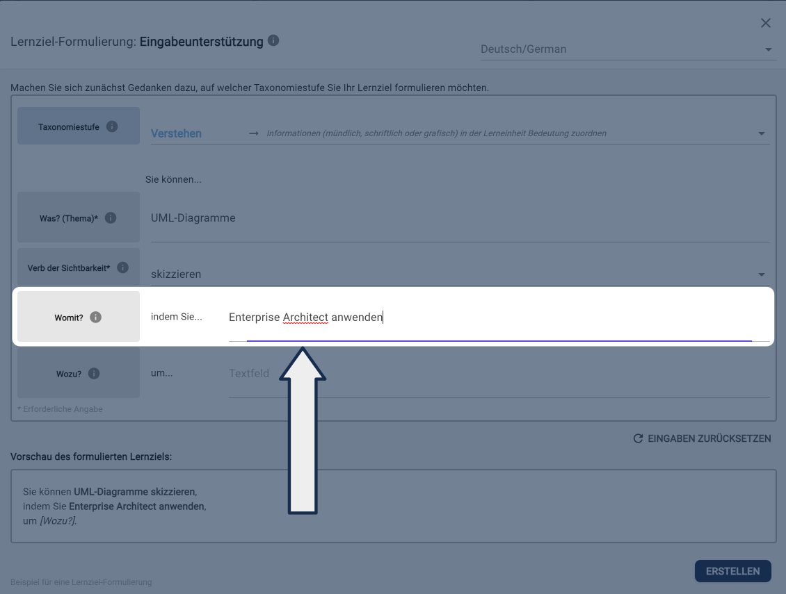 Tragen Sie im Textfeld zu Womit? für Ihr Lernziel ein, mit welchen theoretischen oder praktischen Werkzeugen Lernende ihre Handlungen ausführen.