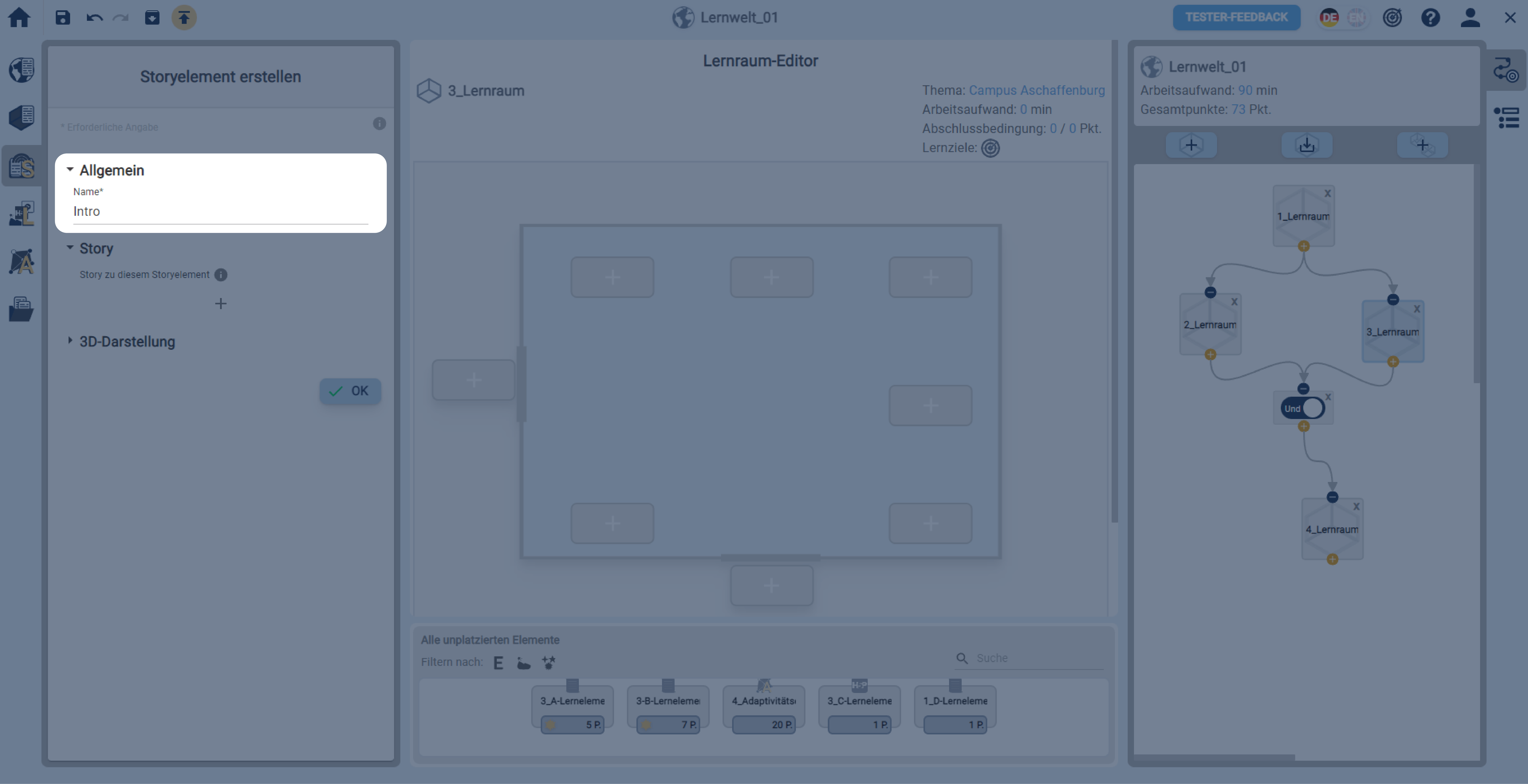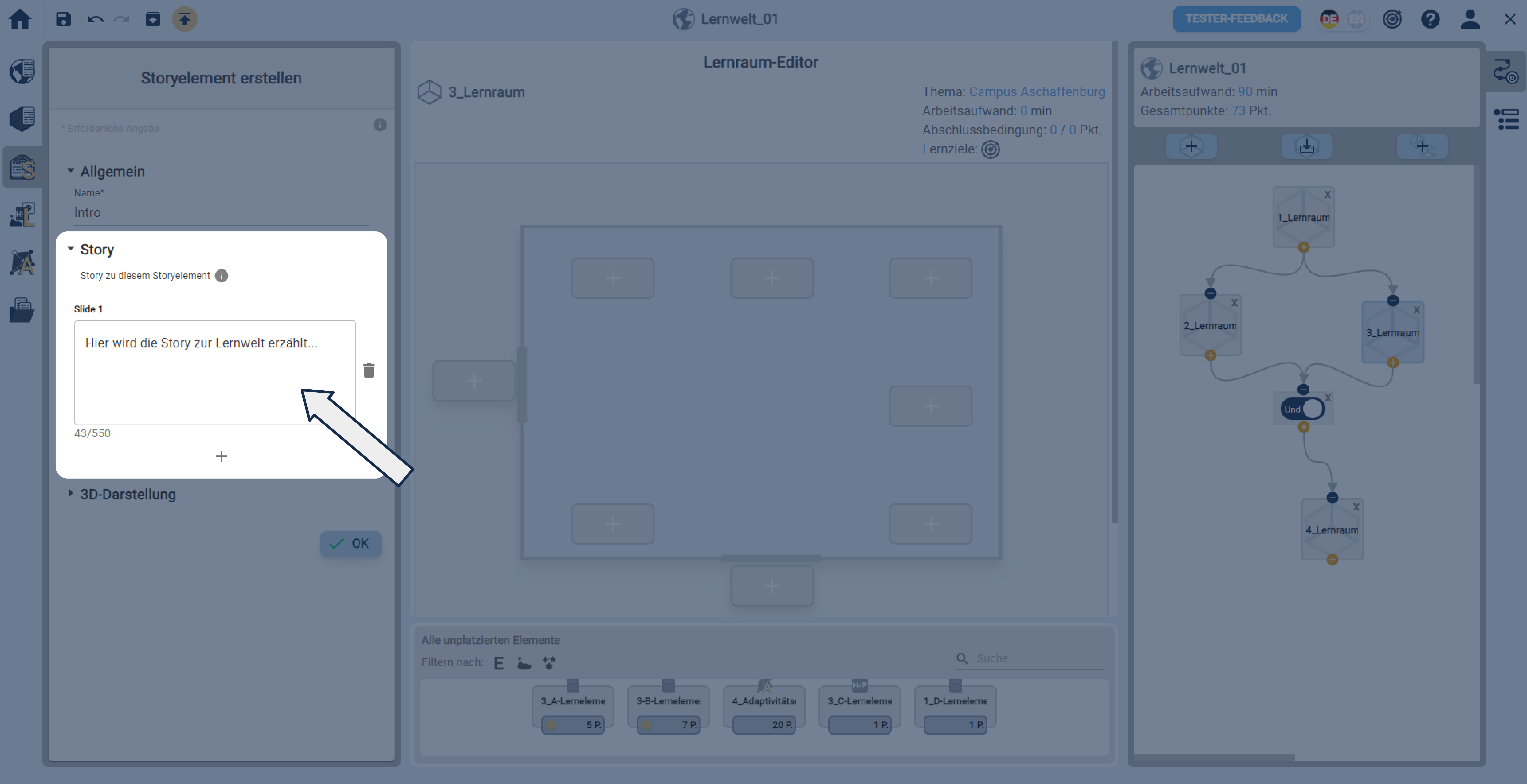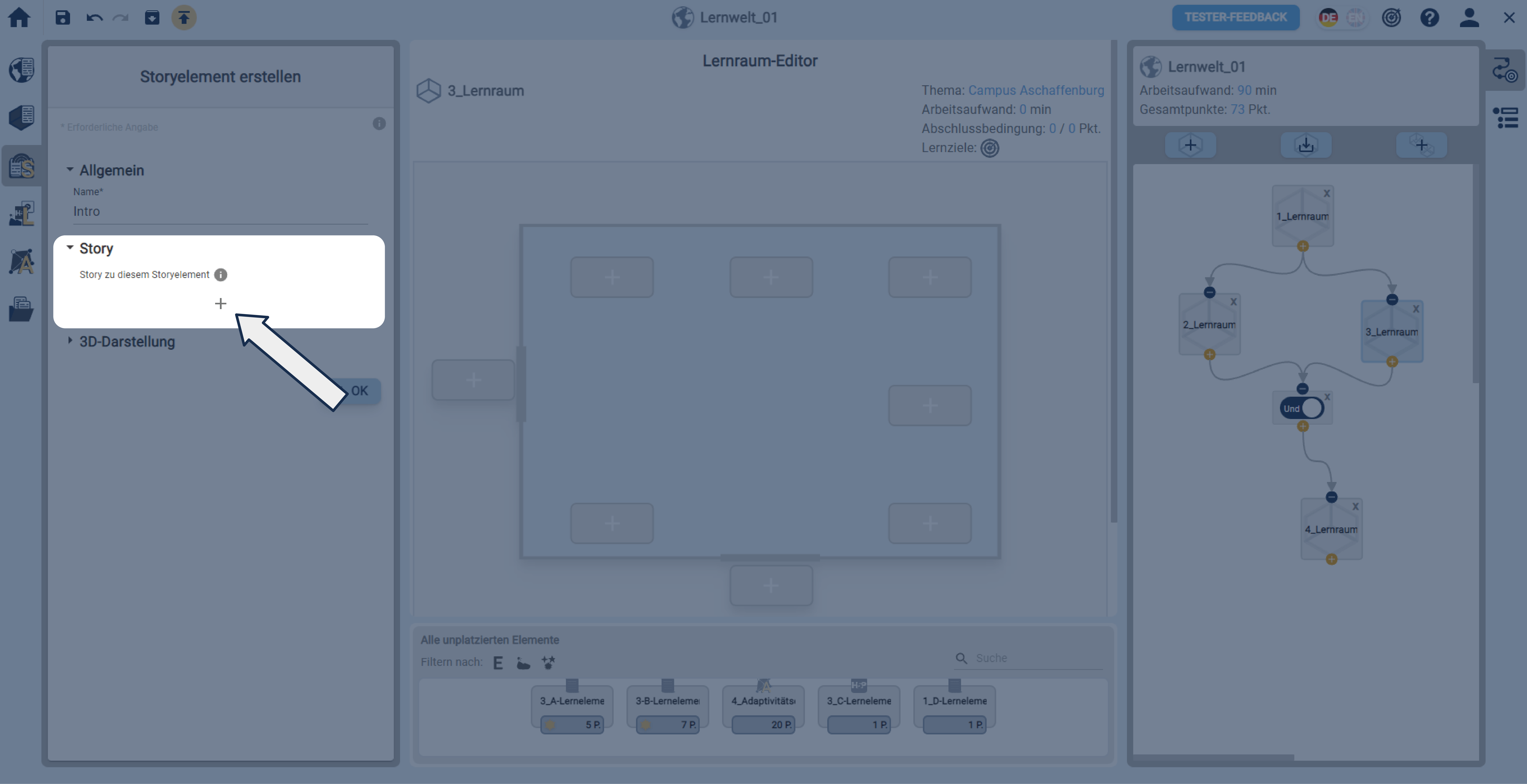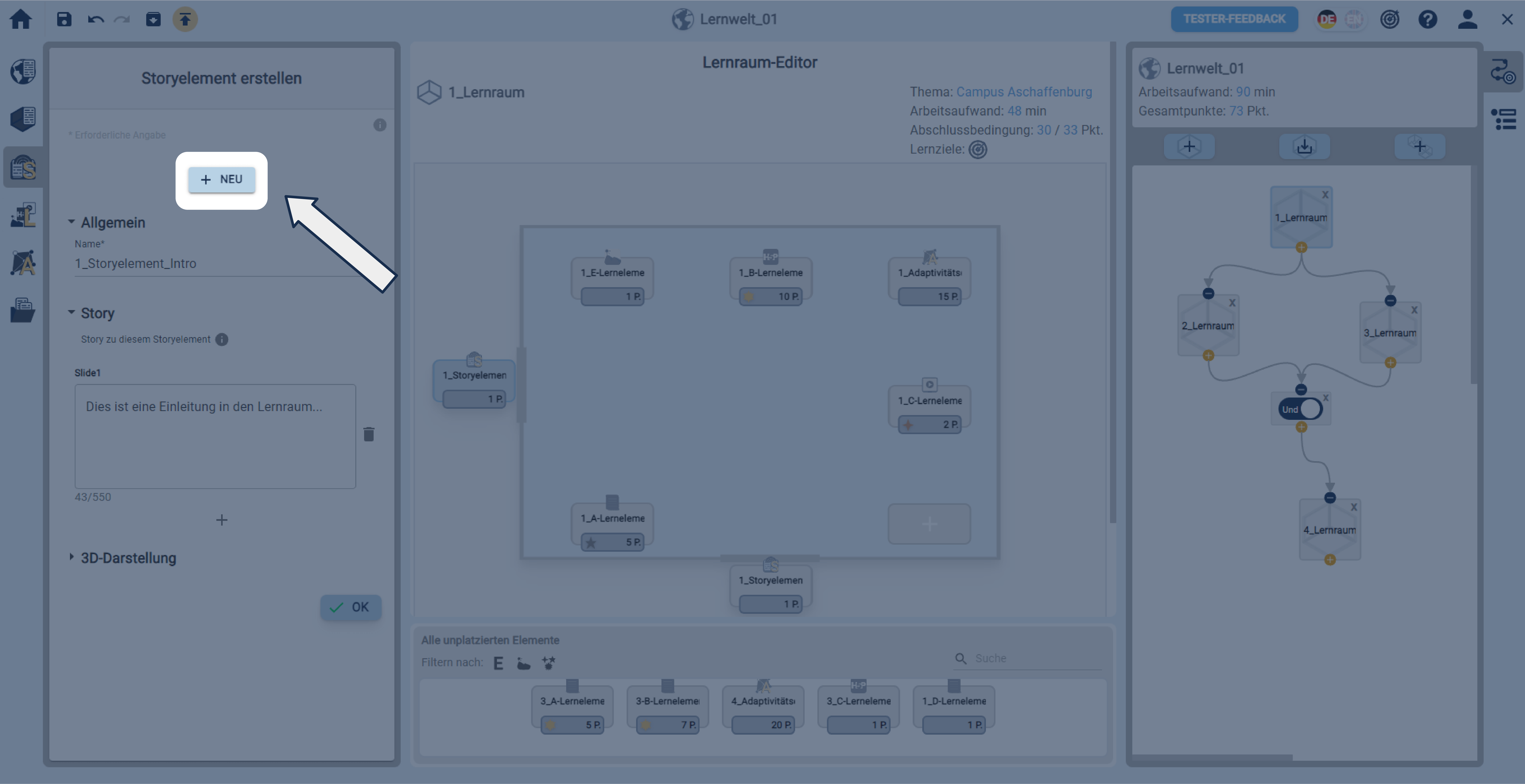 In einer geöffneten Lernwelt ein Storyelement über die linke Sidebar erstellen.