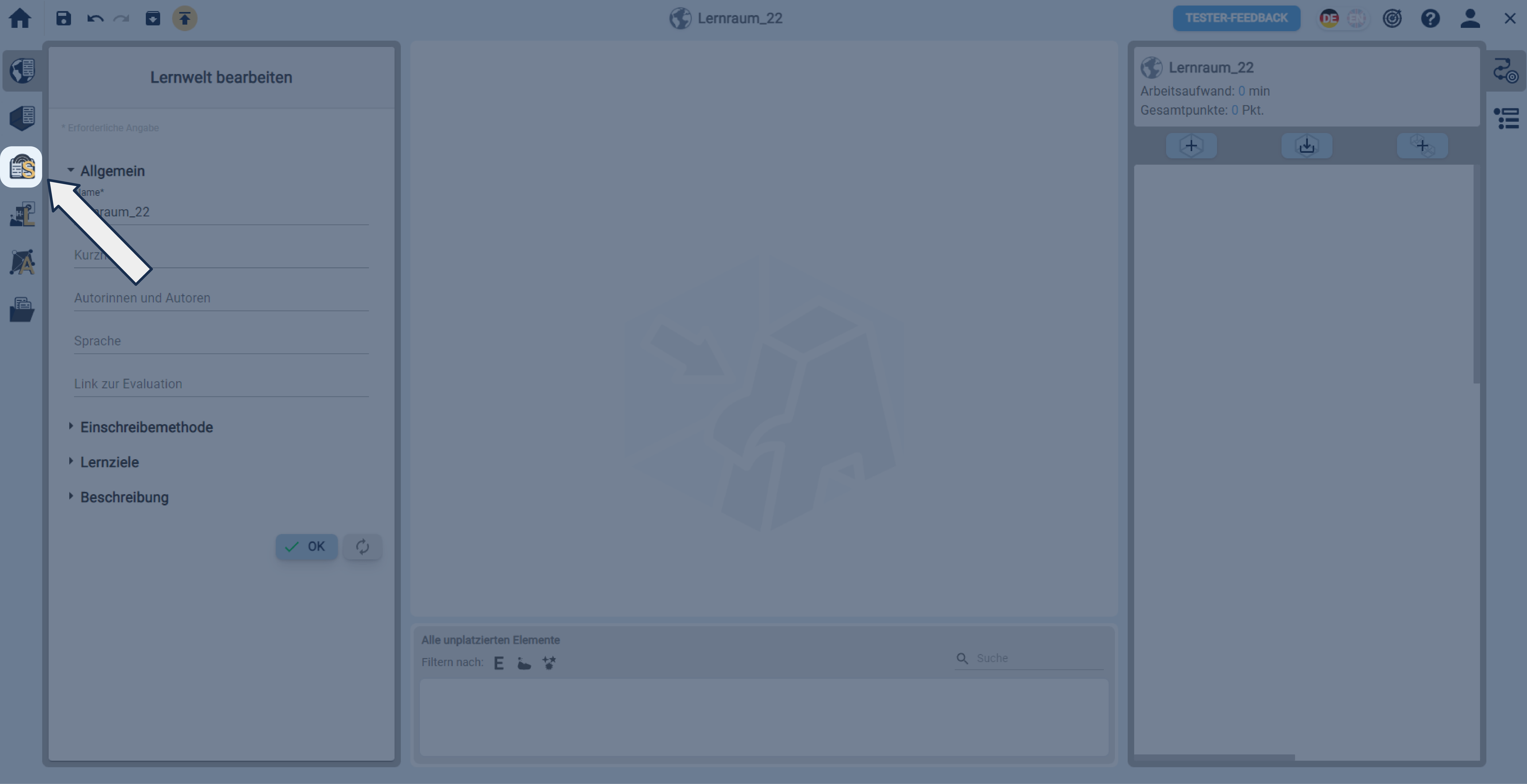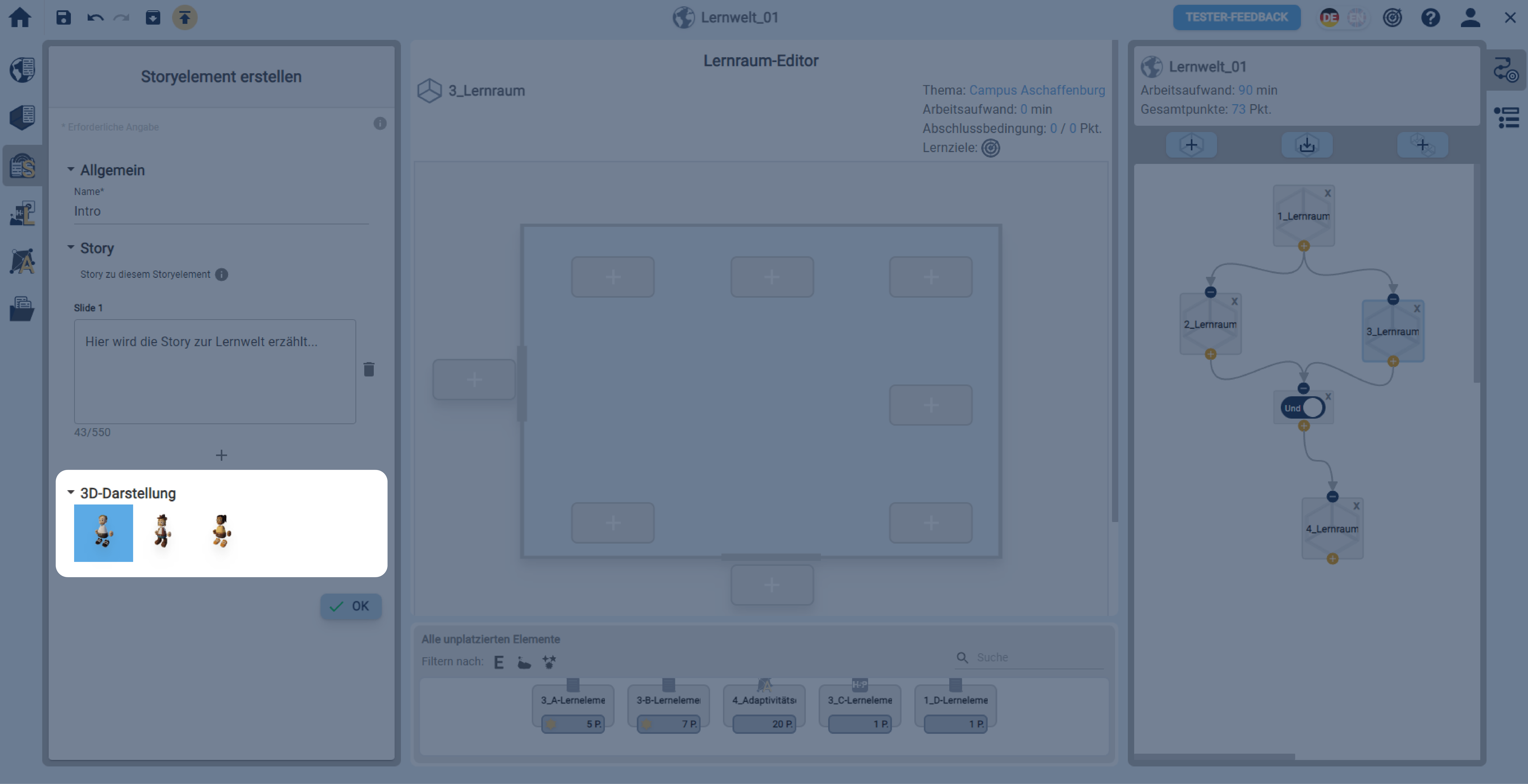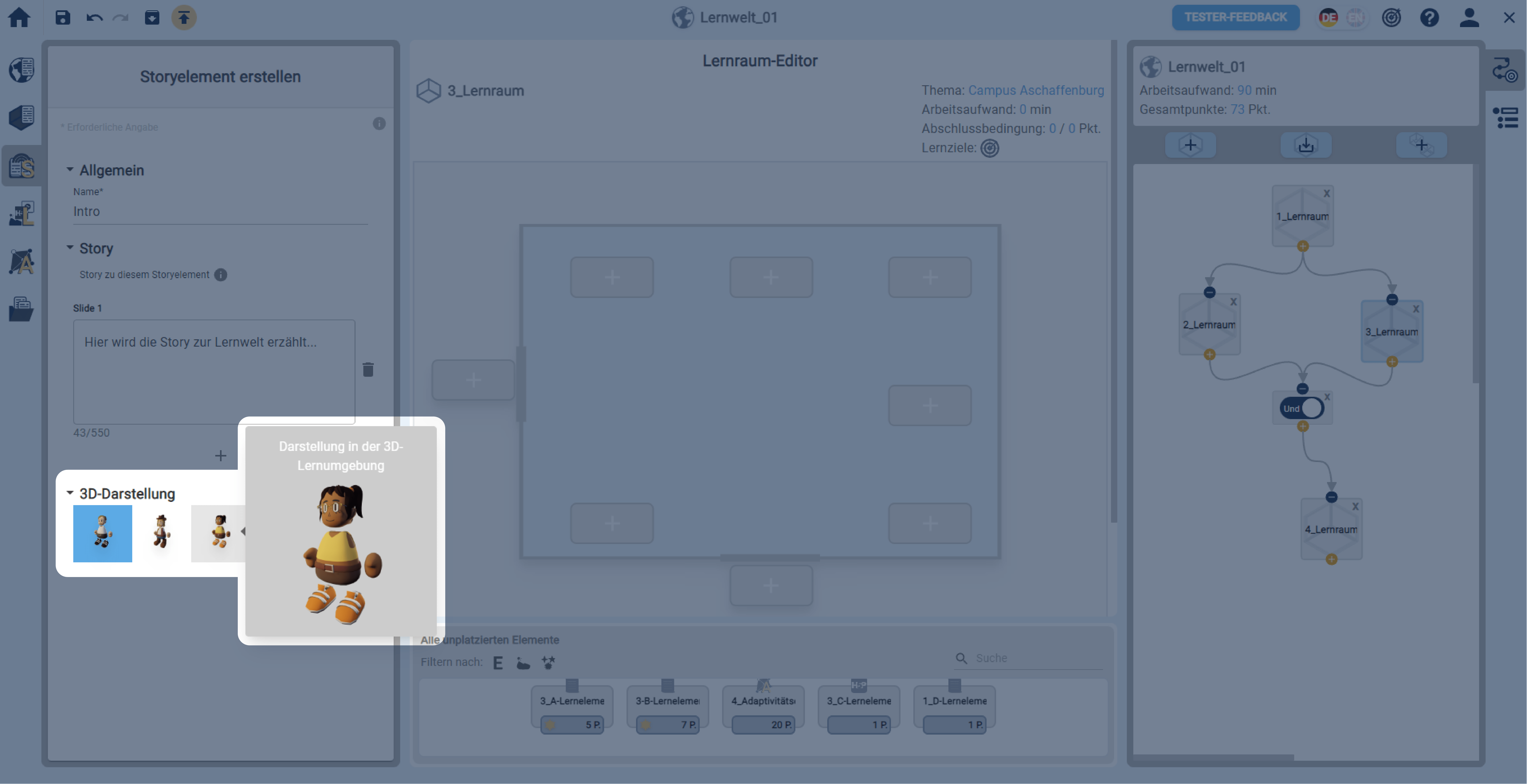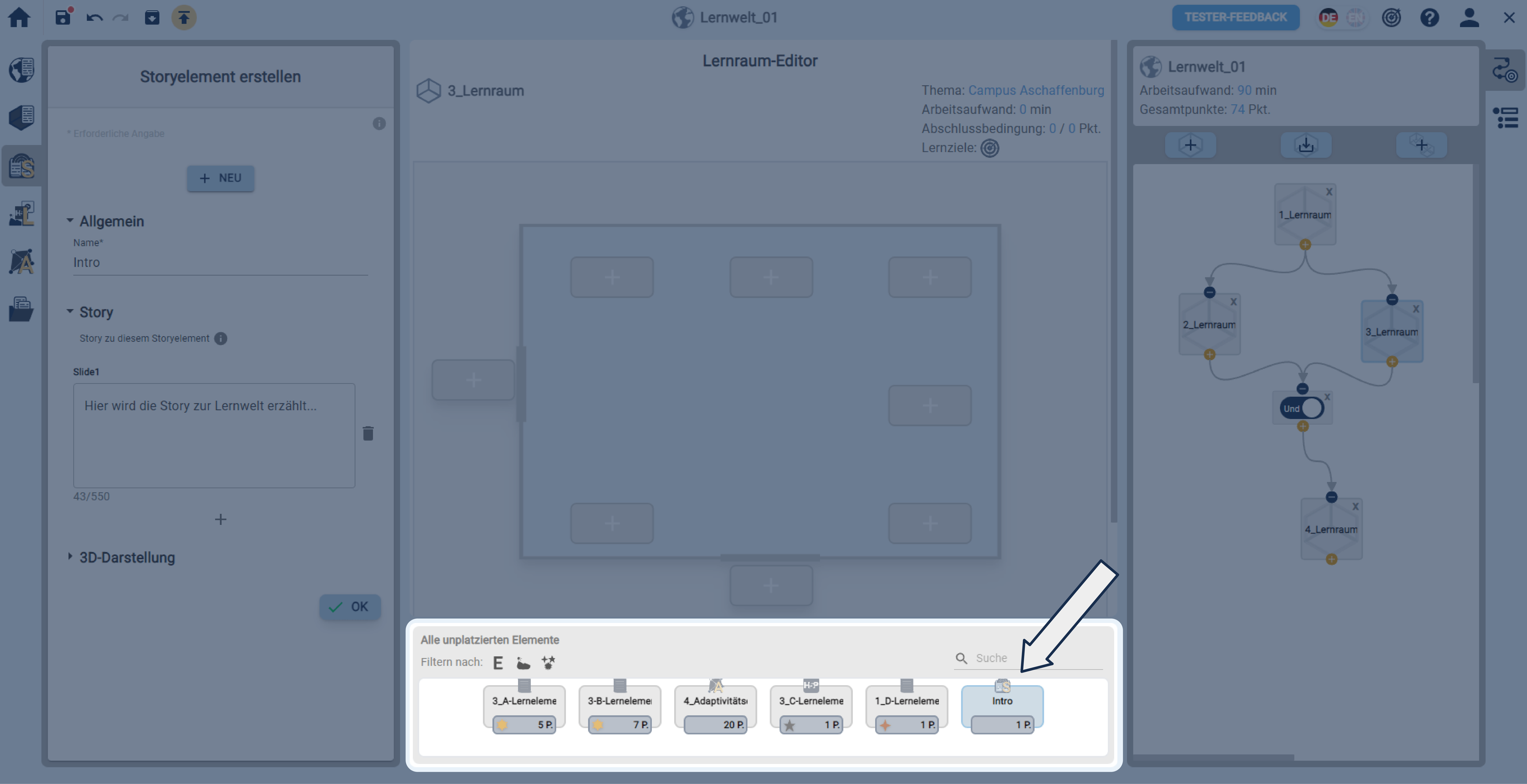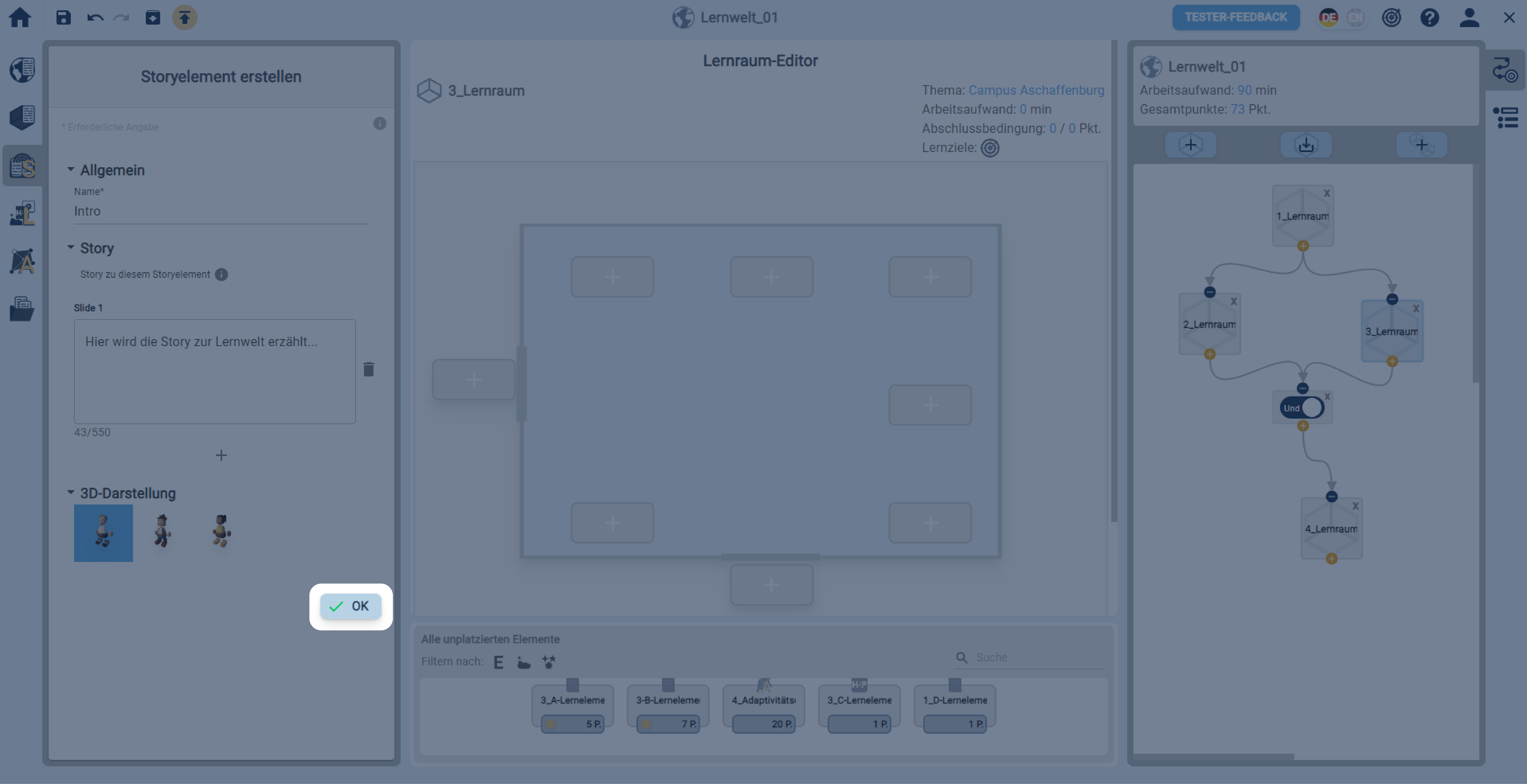 In einer geöffneten Lernwelt ein Storyelement über die linke Sidebar erstellen.