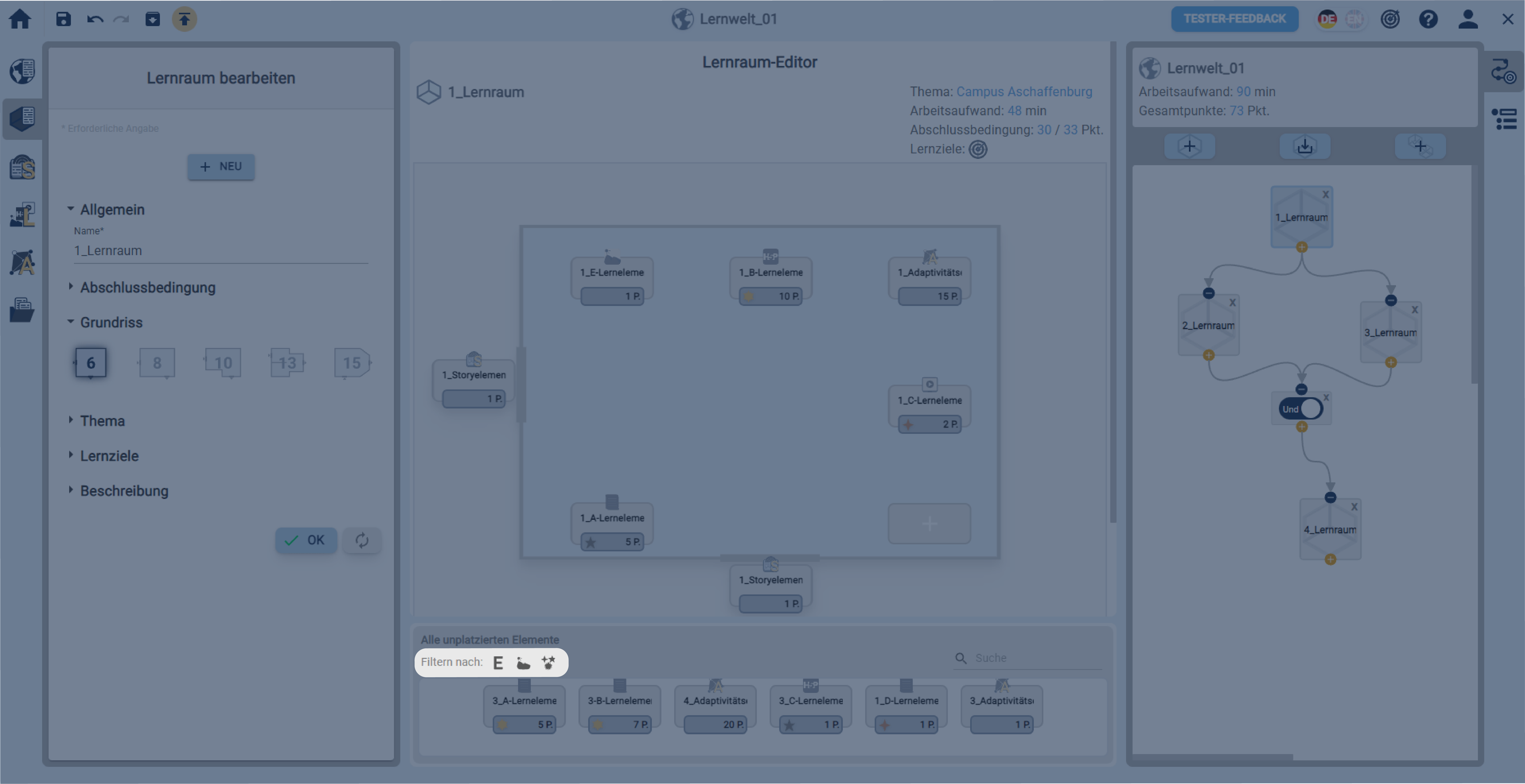 Unplatzierte Elemente nach verschiedenen Kriterien filtern.