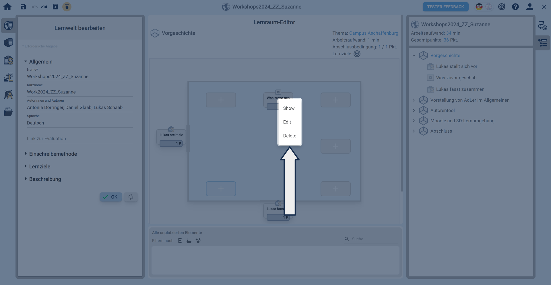 Zu Softwarekomponenten: Lernraum-Editor und Unplatzierte Elemente.