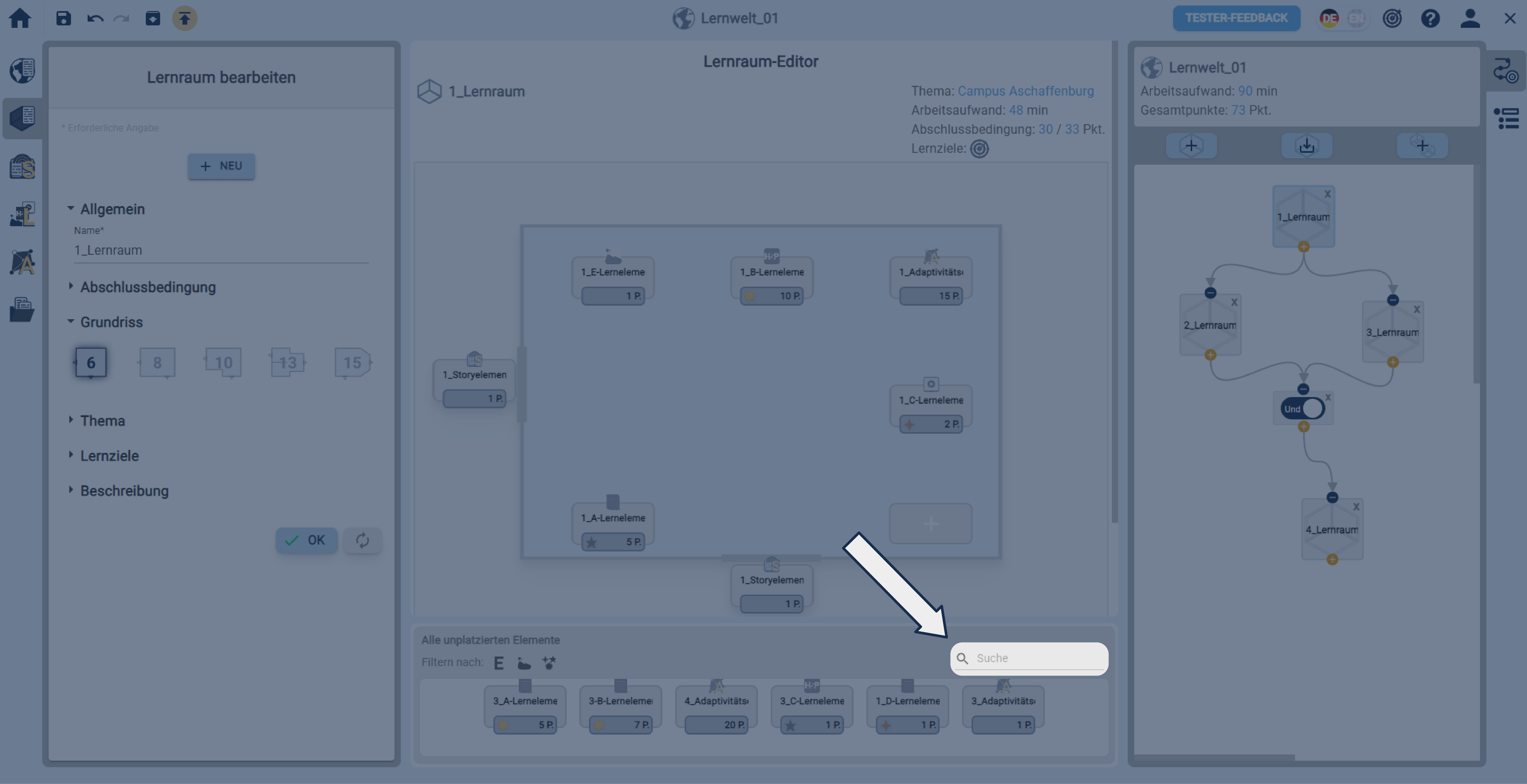 Unplatzierte Elemente über die Suchfunktion suchen.