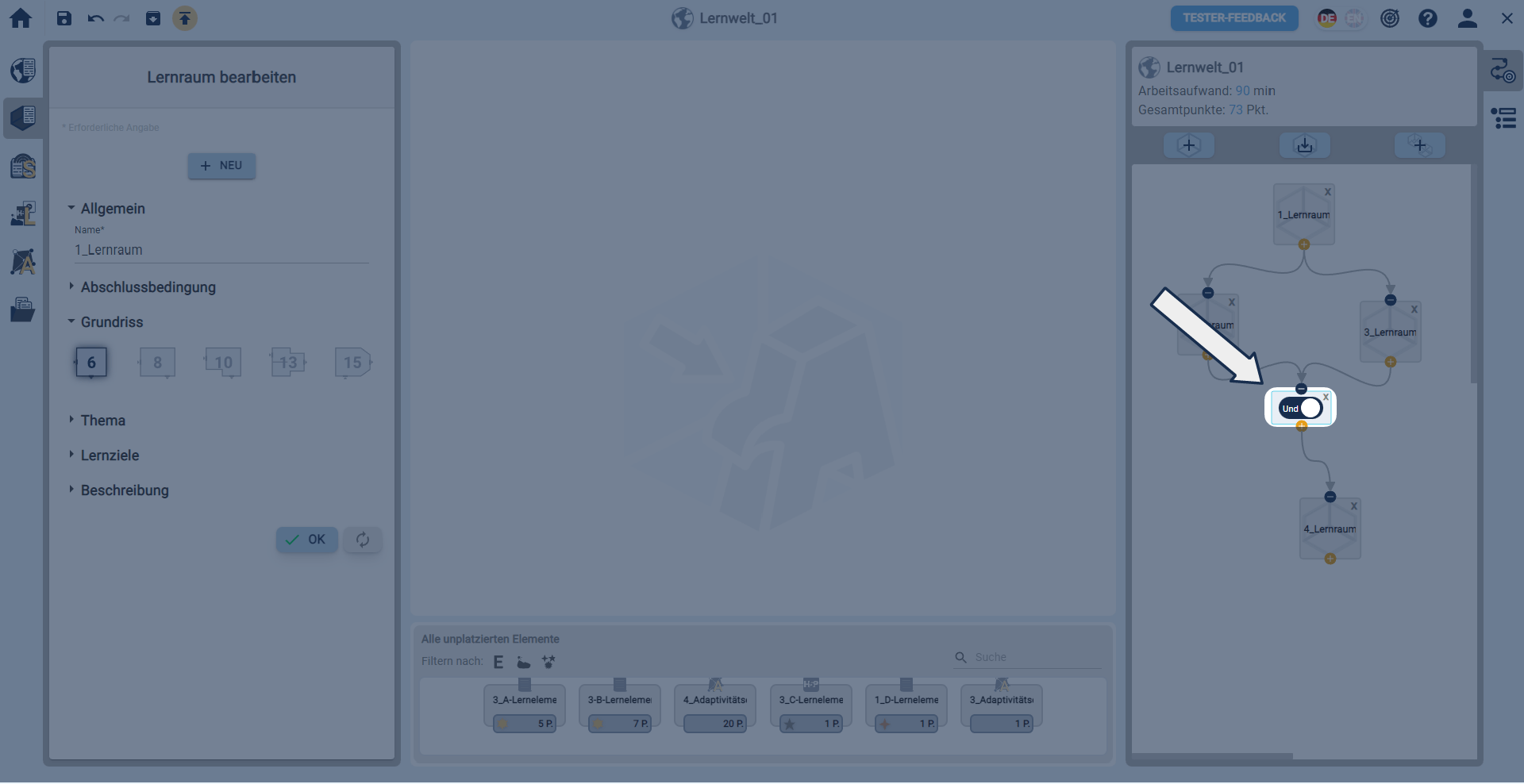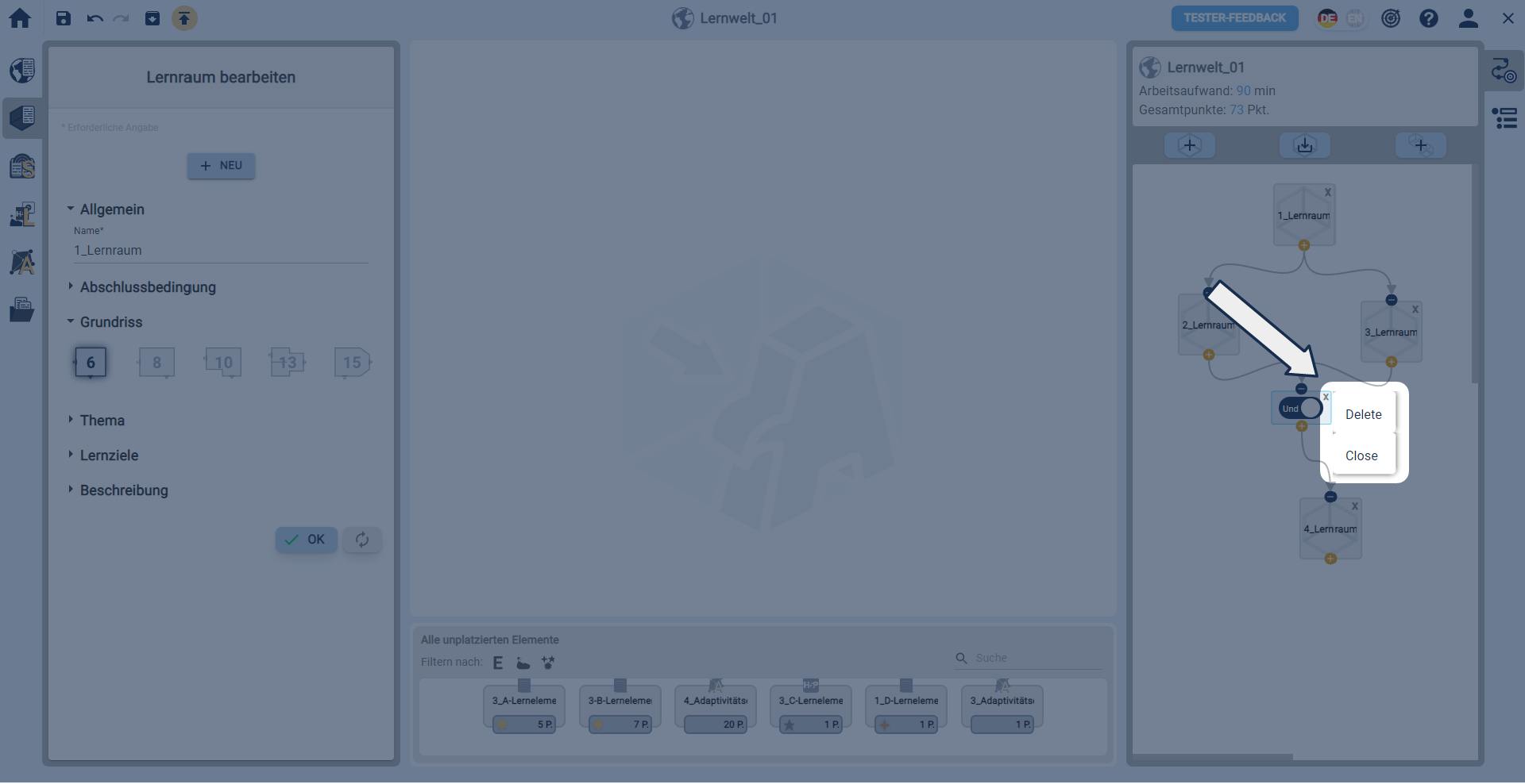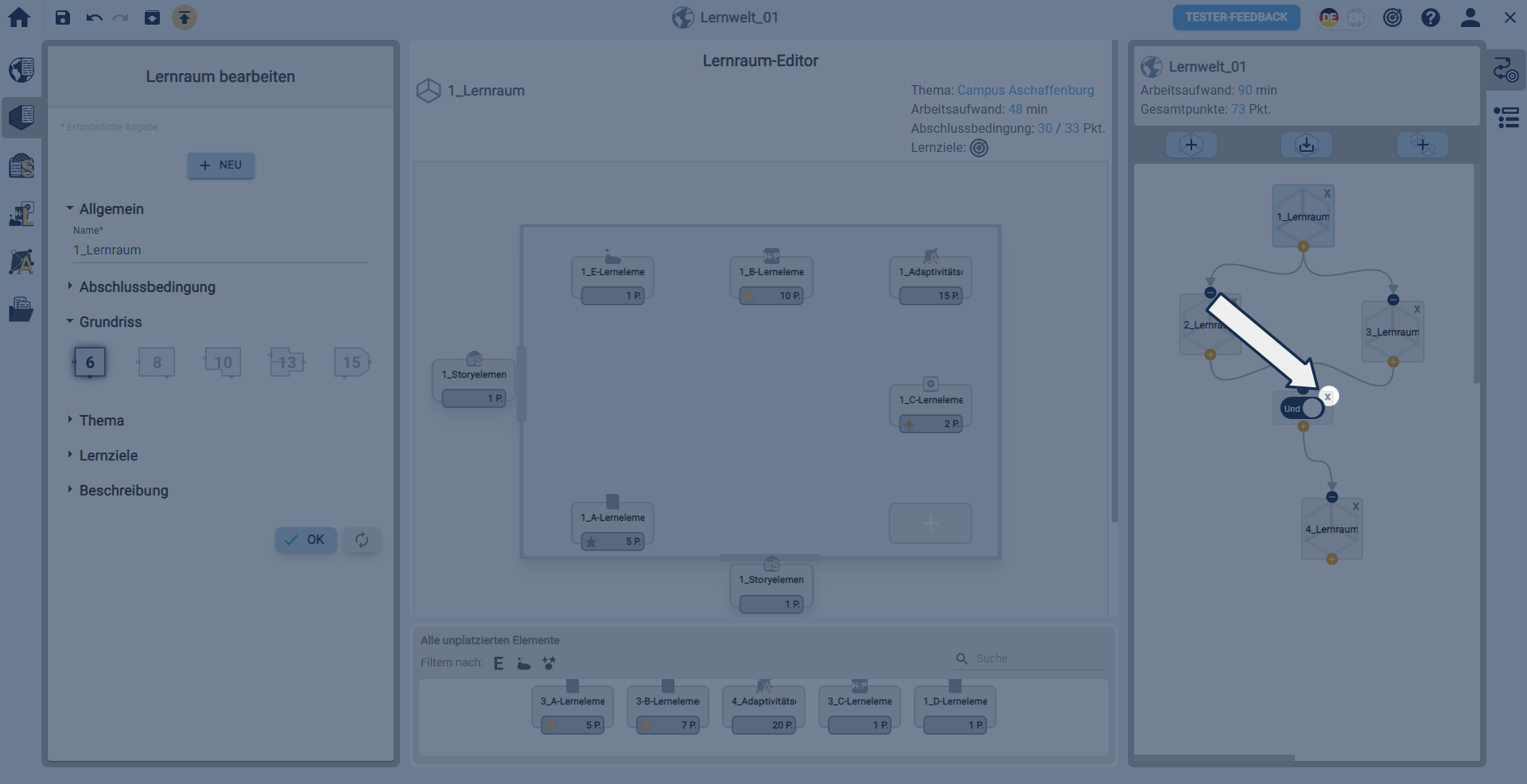 Und-/Oder-Bedingung können in der rechten Sidebar über den Tab Verbindungen zwischen Lernräumen gelöscht werden.