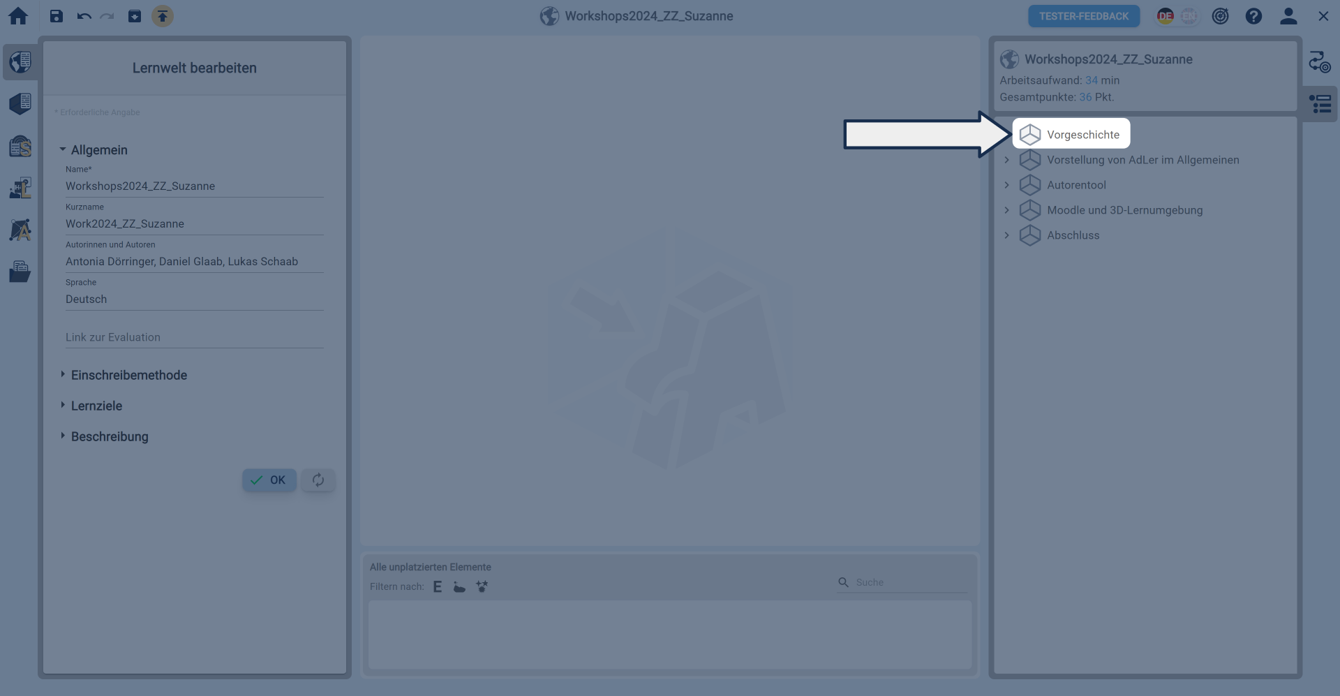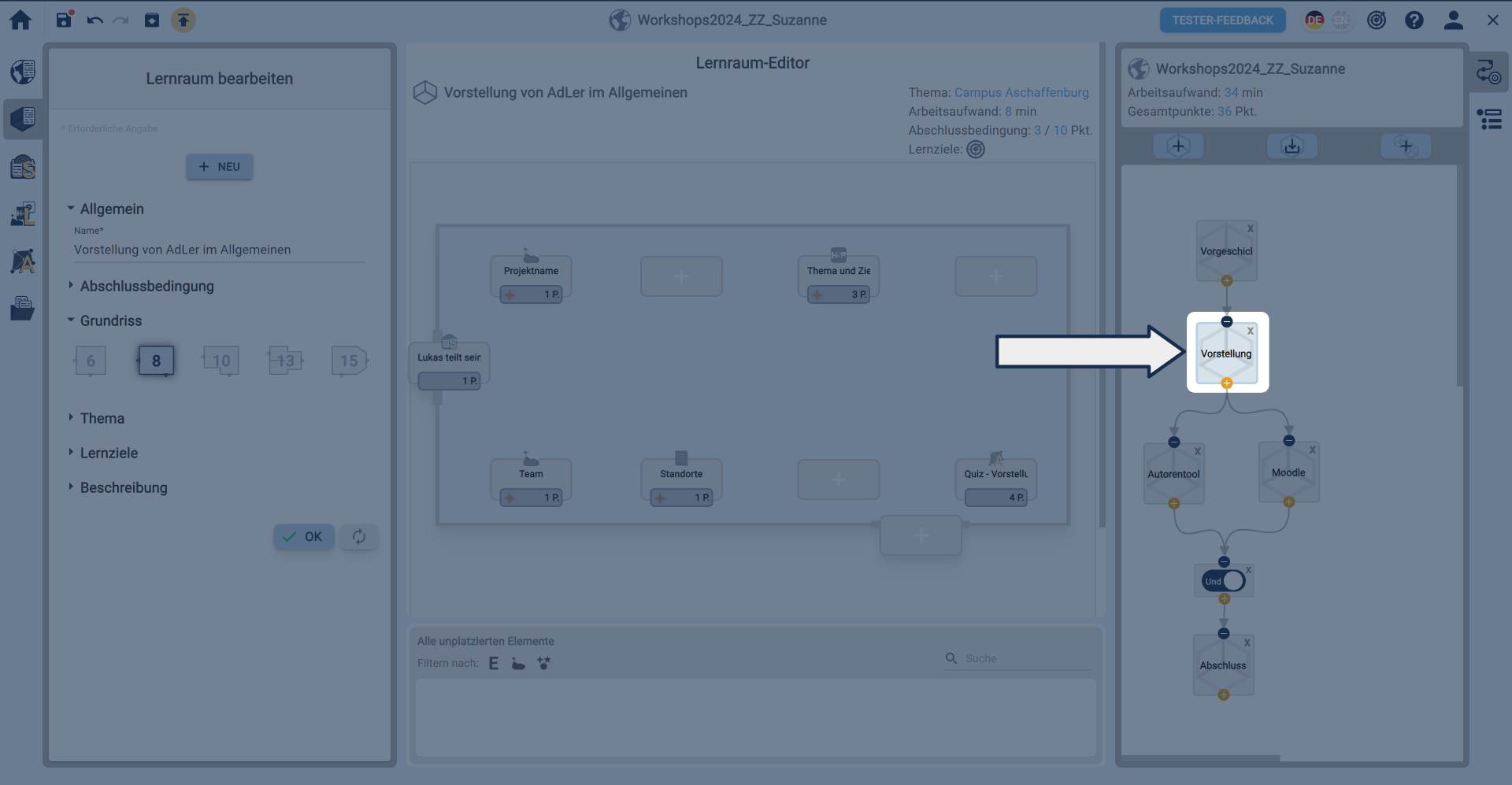 Ein Lernraum kann in der rechten Sidebar über die beiden verfügbaren Tabs Verbindungen zwischen Lernräumen und Hierarchischer Aufbau der Lernwelt bearbeitet werden.