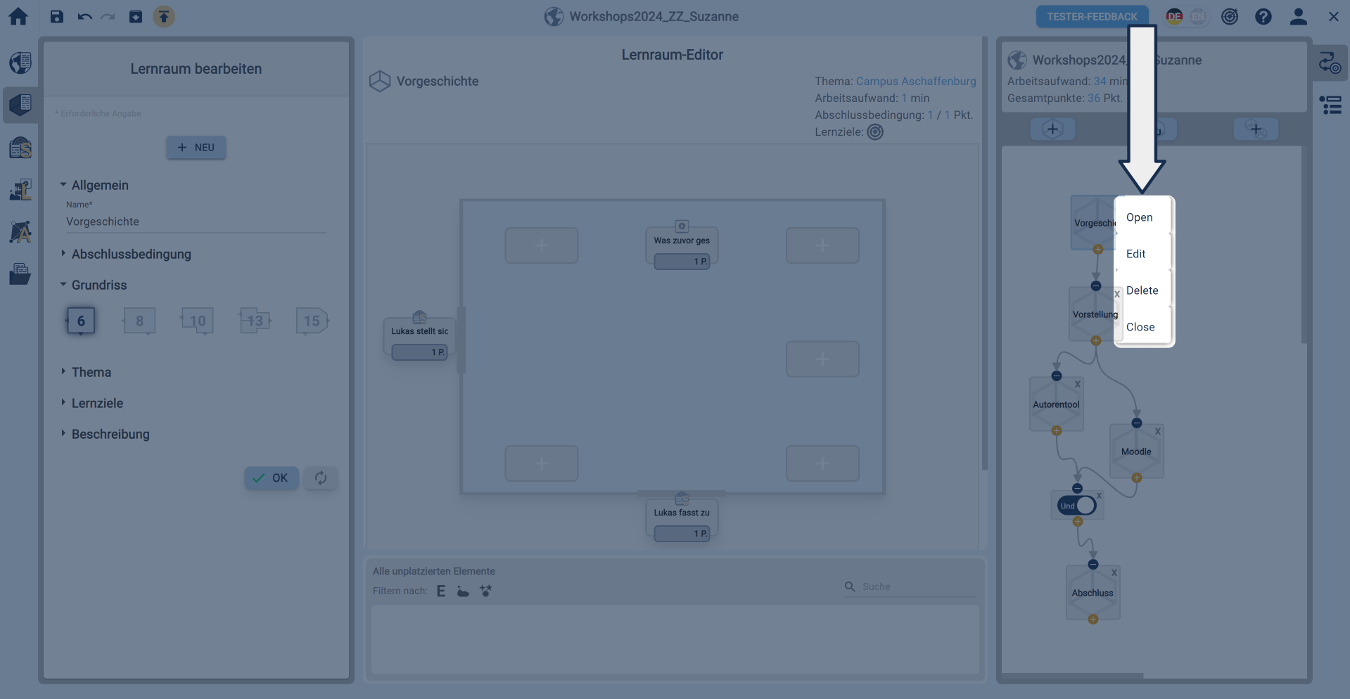 Den Bearbeitungsmodus zu einem bereits erstellten Lernraum von der rechten Sidebar aus aktivieren.