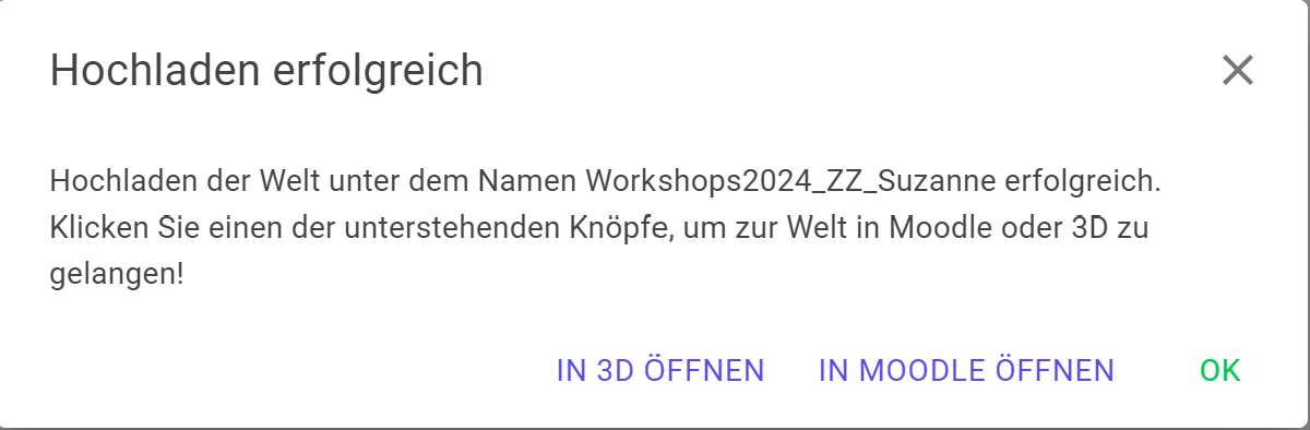 Drücken Sie auf den Button Lernwelt ersetzen, um die ausgewählte Lernwelt in Moodle hochzuladen und die vorhandene somit zu überschreiben. Drücken Sie auf den Button Kopie von Lernwelt erstellen, um die Lernwelt als Kopie der vorhandenen hochzuladen - ein separater Kurs wird erstellt. Drücken Sie alternativ den Button Abbrechen, um den Bestätigungsdialog ohne Hochladen zu beenden.