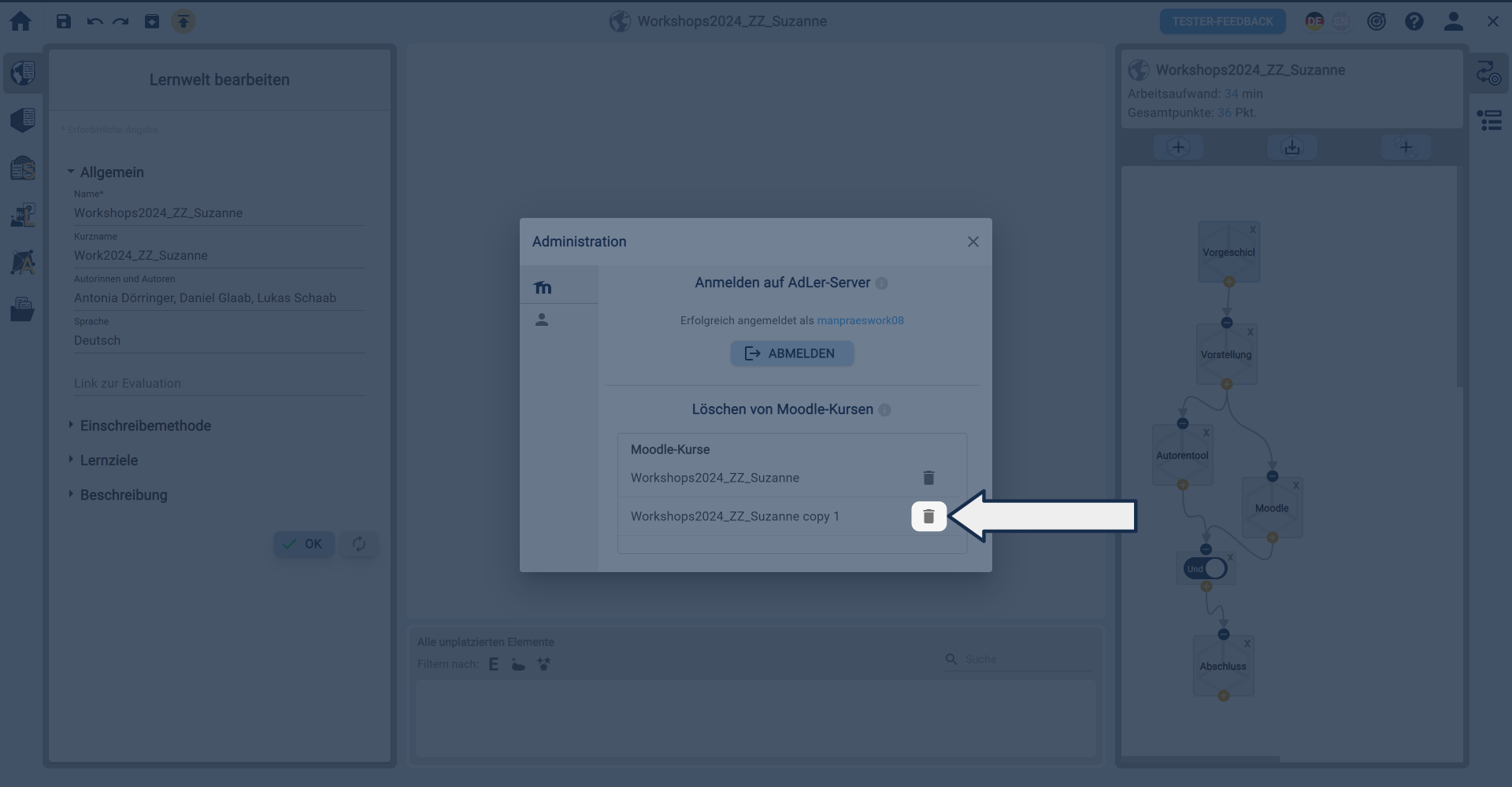 Löschen eines bereits erstellten Moodle-Kurses vom AdLer-Server. Ein Moodle-Kurs entspricht einer AdLer-Lernwelt.