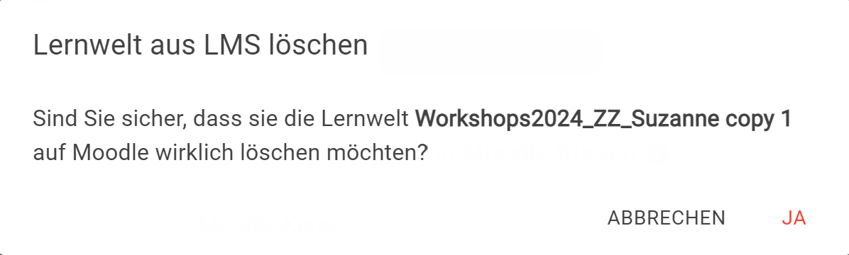 Drücken Sie den Button Ja des angezeigten Bestätigungsdialoges, um den entsprechenden Moodle-Kurs endgültig und unwiderruflich zu löschen. Sie können alternativ den Dialog durch Klicken des Buttons Abbrechen ohne Löschung beenden.