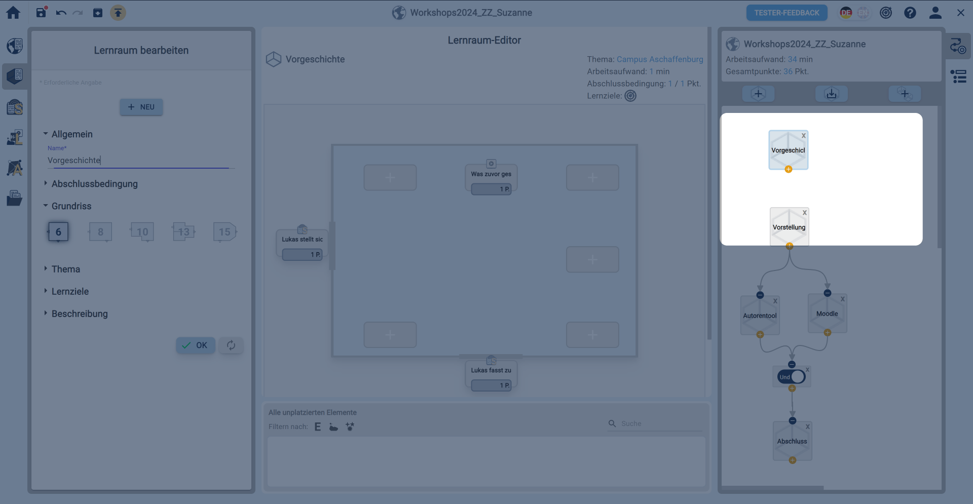 Klicken Sie mit der linken Maustaste beim oberhalb platzierten Lernraum auf den gelben Kreis mit Plus-Symbol.