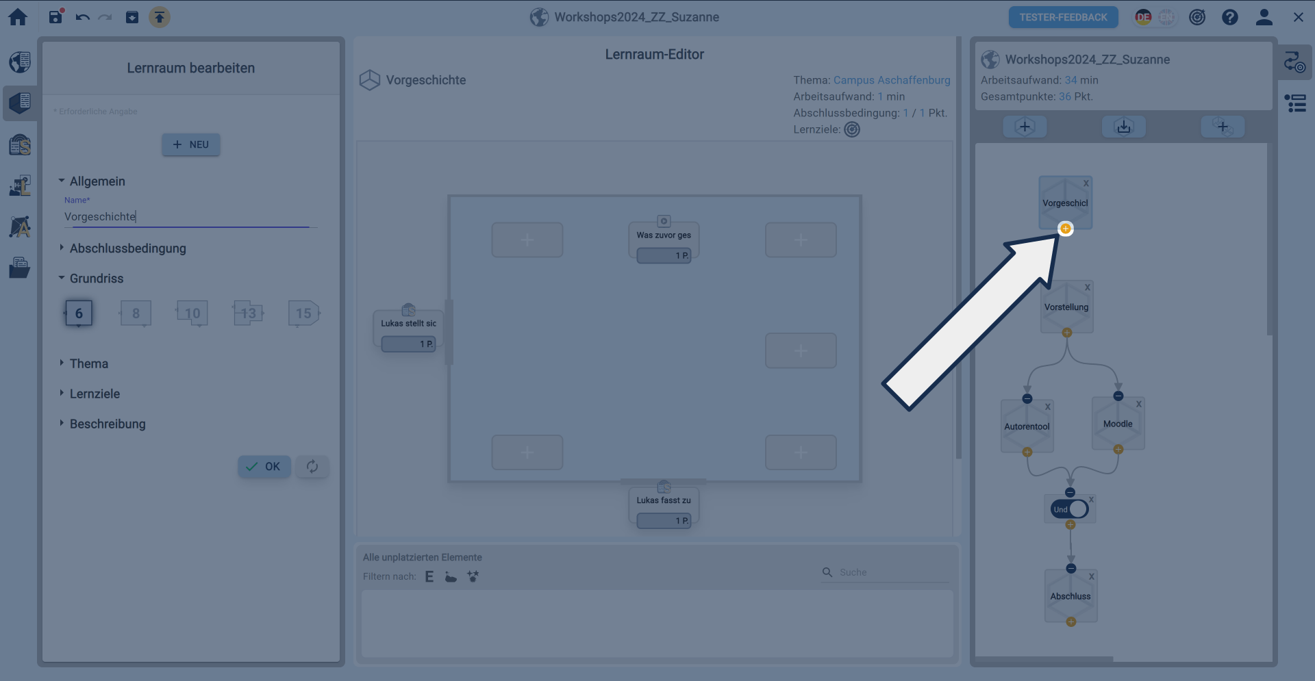 Halten Sie die Maustaste weiterhin gedrückt und ziehen Sie den automatisch erzeugten grauen Pfeil in Richtung des unterhalb liegenden Lernraums.