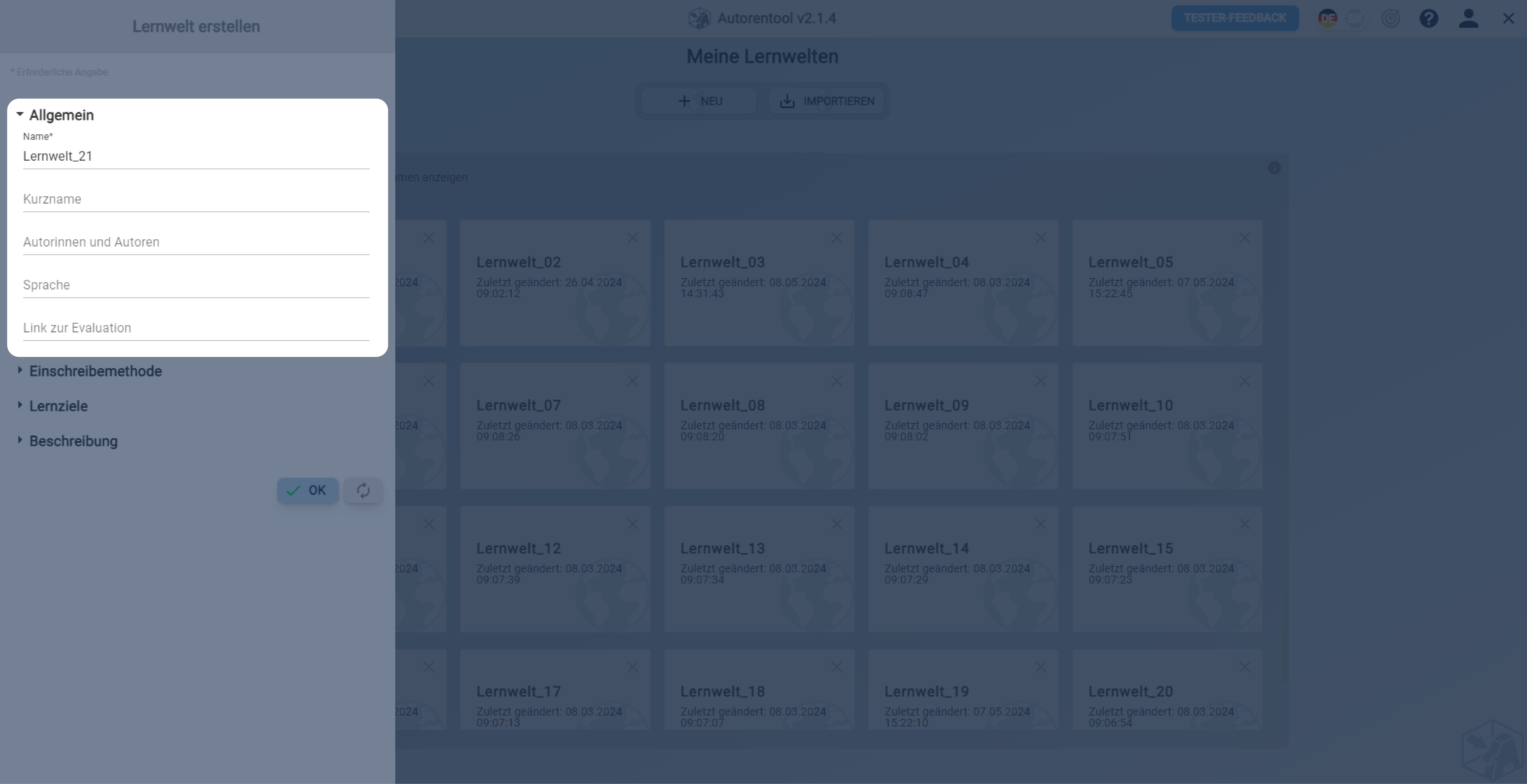 Eine neue Lernwelt erstellen und diese Lernwelt mit Metadaten und weiteren Informationen versehen.