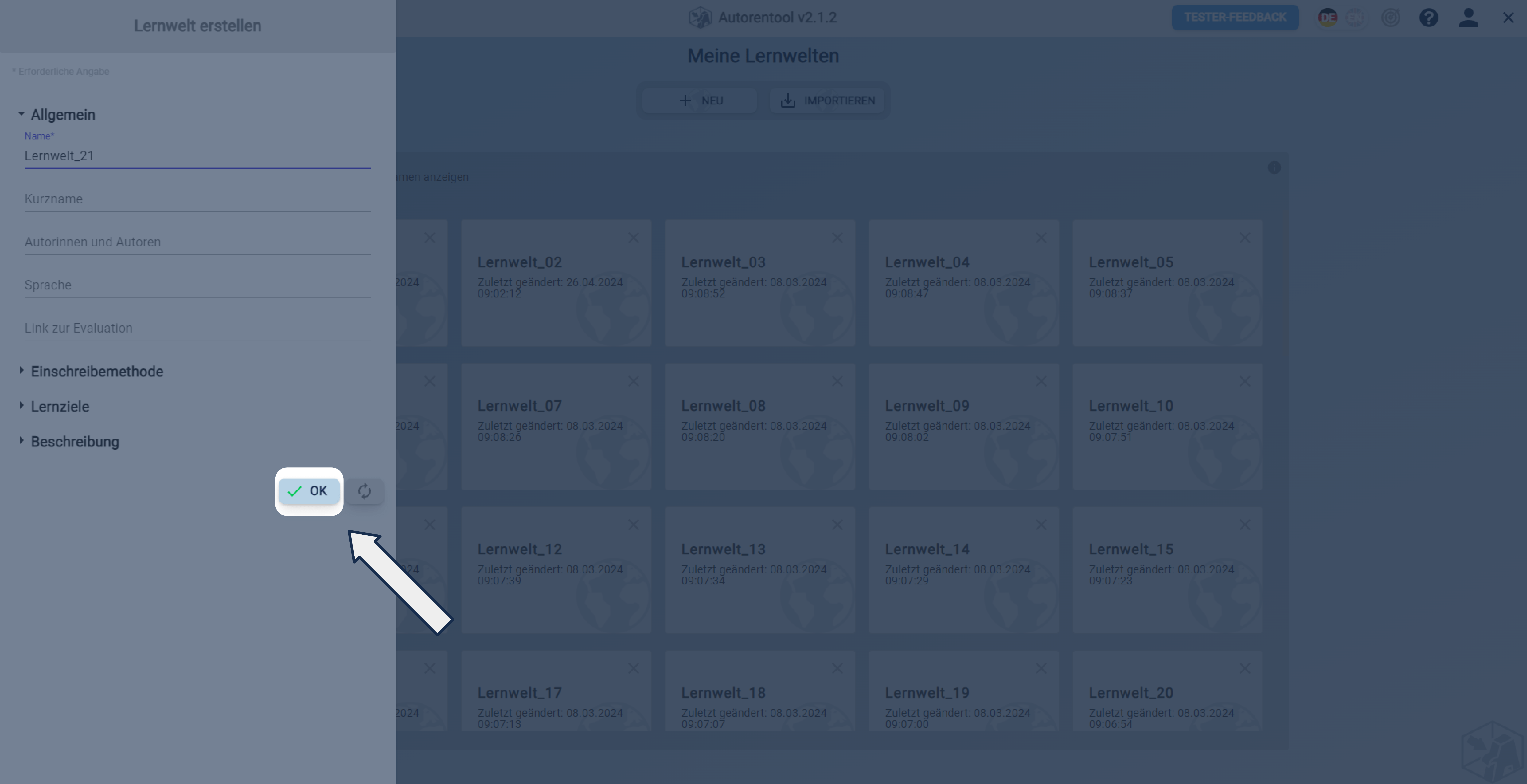 Bestätigen Sie Ihre Angaben zur Lernwelt mit einem Klick auf den Button OK.