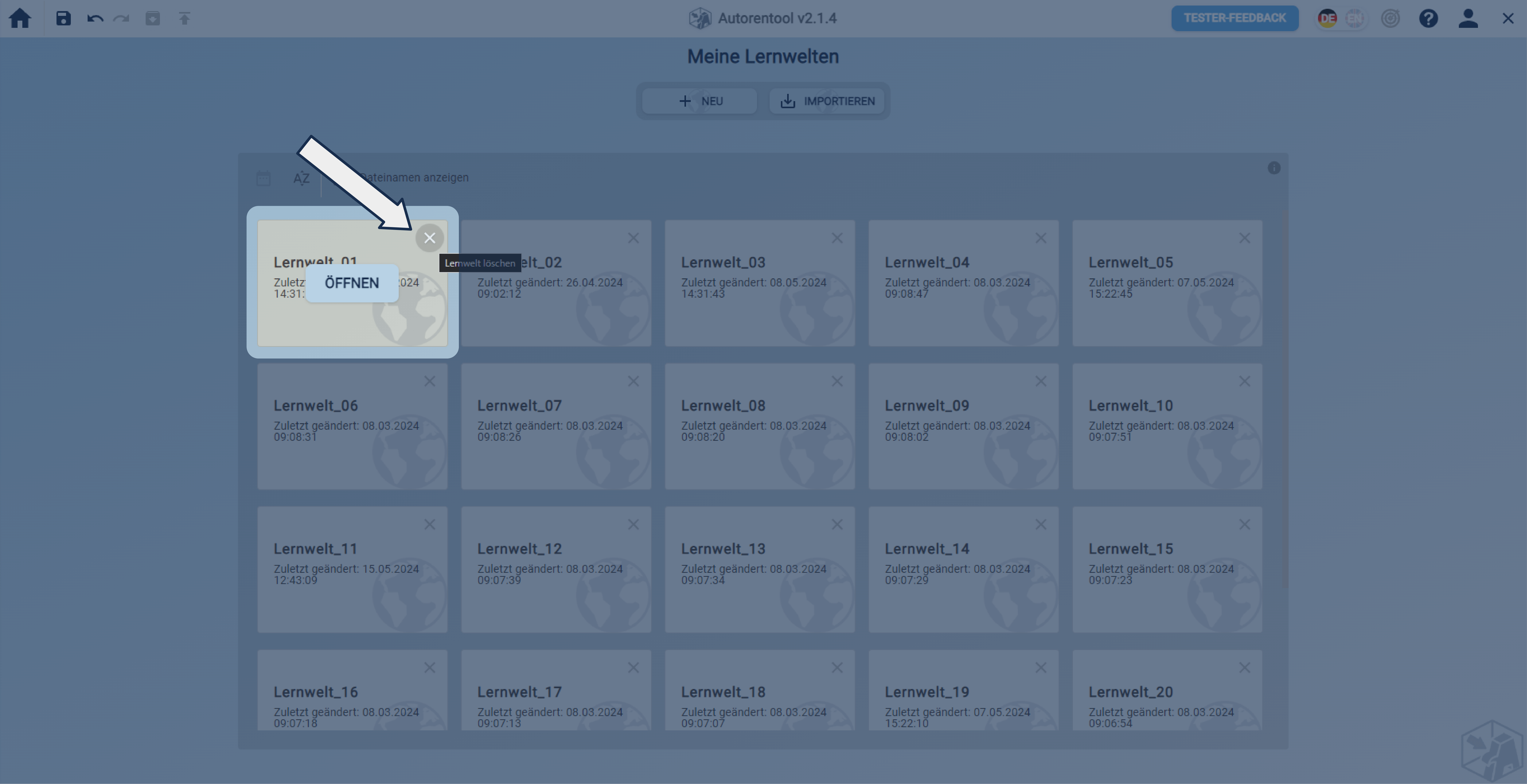 Suchen Sie in der Übersicht die als weißes Rechteck dargestellte und zu löschende Lernwelt.