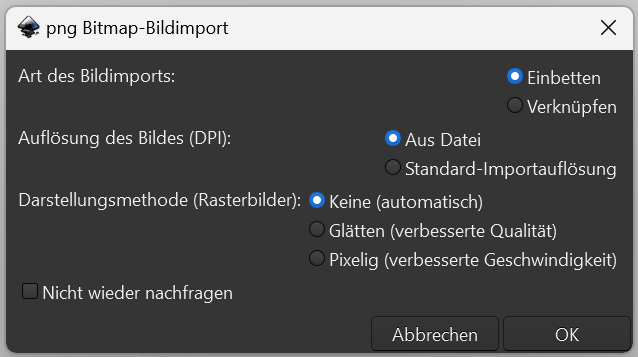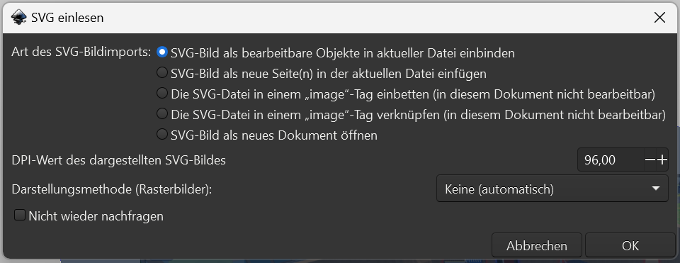 Wählen Sie die Optionen im nun geöffneten Inkscape-Dialogfenster, wie auf dem folgenden Screenshot dargestellt.