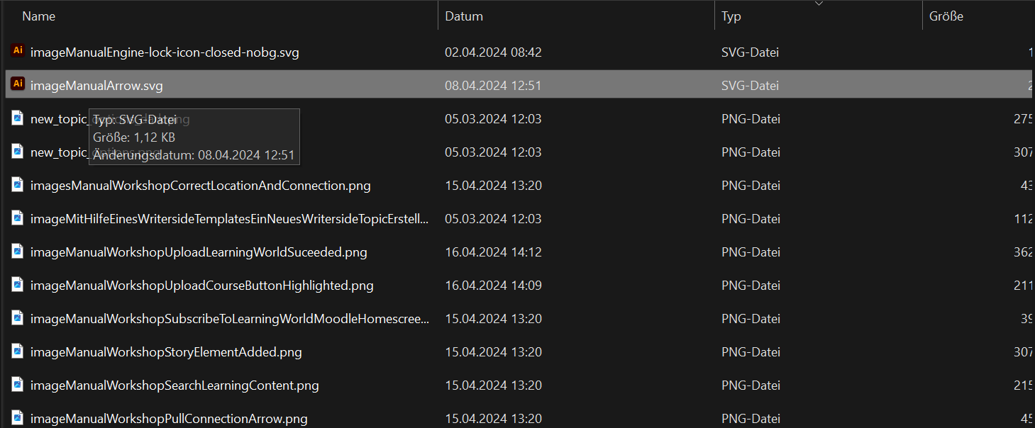 Öffnen Sie in ihrem Betriebssystem ihren Datei-Explorer und navigieren Sie in das AdLer Dokumentationsrepository. Öffnen Sie dort den Pfad AdLerDokumentation/Writerside/images. Dort befindet sich die Datei imageManualArrow.svg. Klicken Sie mit der linken Maustaste auf diese Datei und ziehen Sie sie mit gedrückter linker Maustaste in den Arbeitsbereich von Inkscape. Lassen Sie nun die linke Maustaste los.