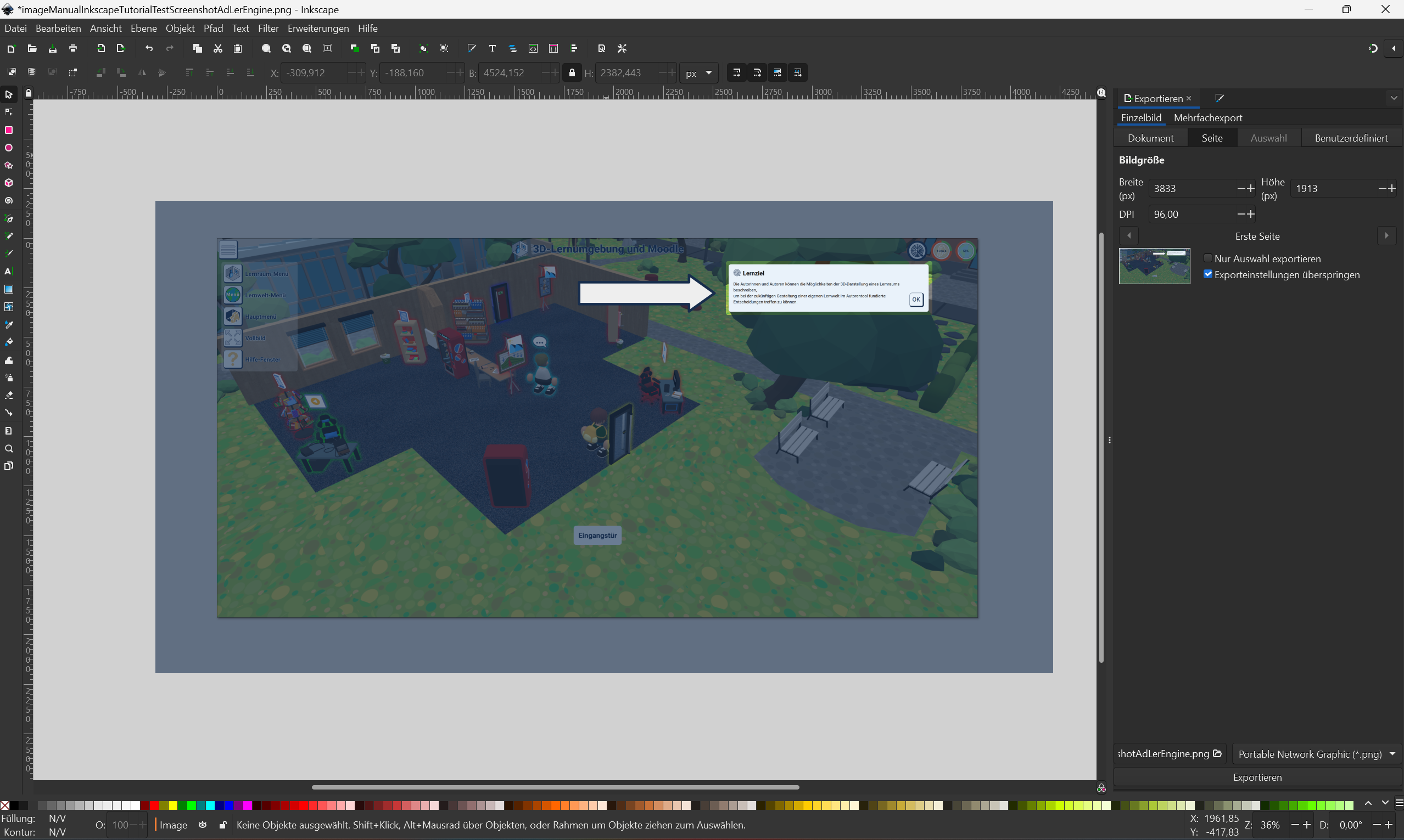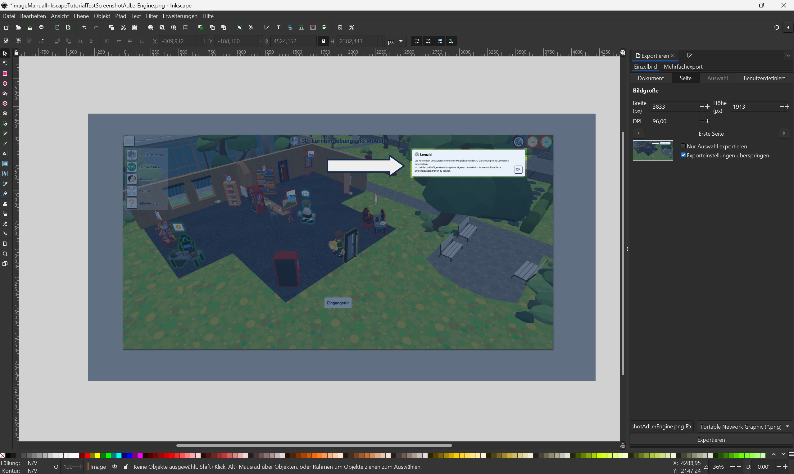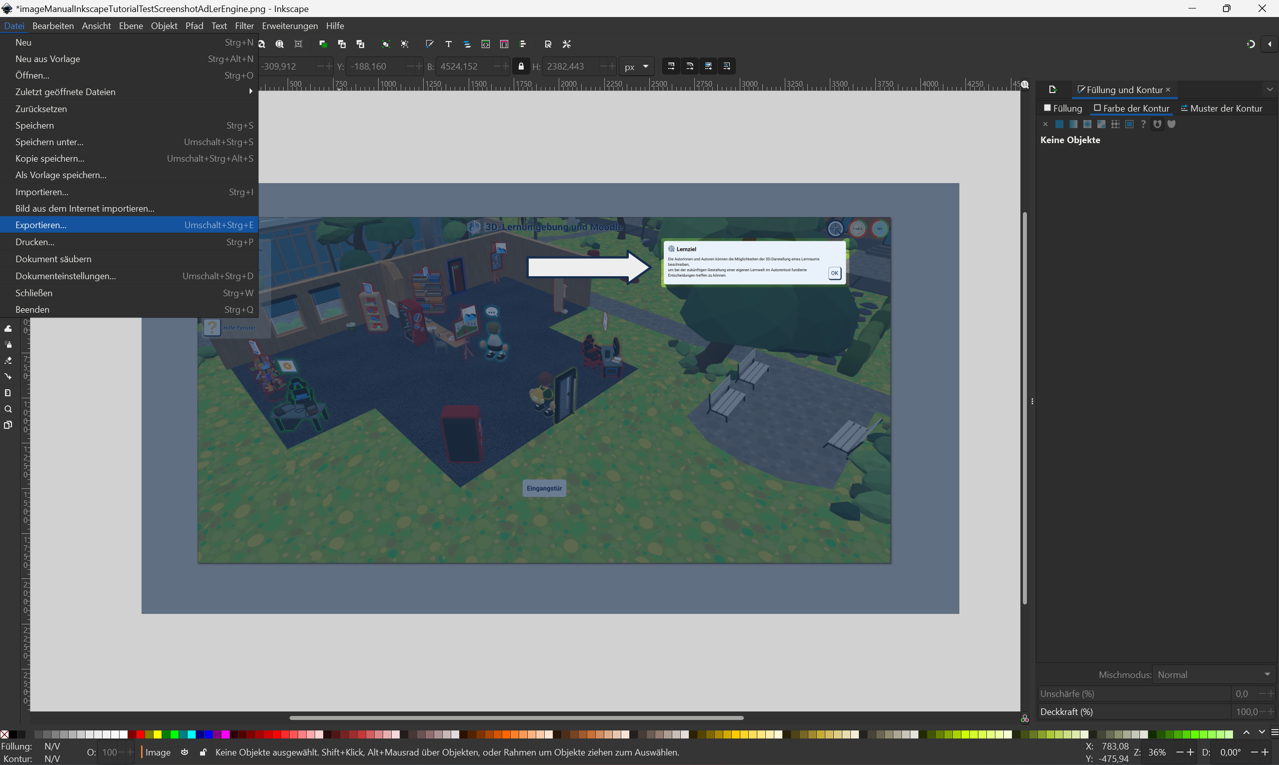 Sie erstellen eine in der AdLer Dokumentation nutzbare .png Datei und exportieren diese. Zusätzlich speichern Sie die offenen Daten der Datei als .svg Datei im AdLer Dokumentationsrepository ab.